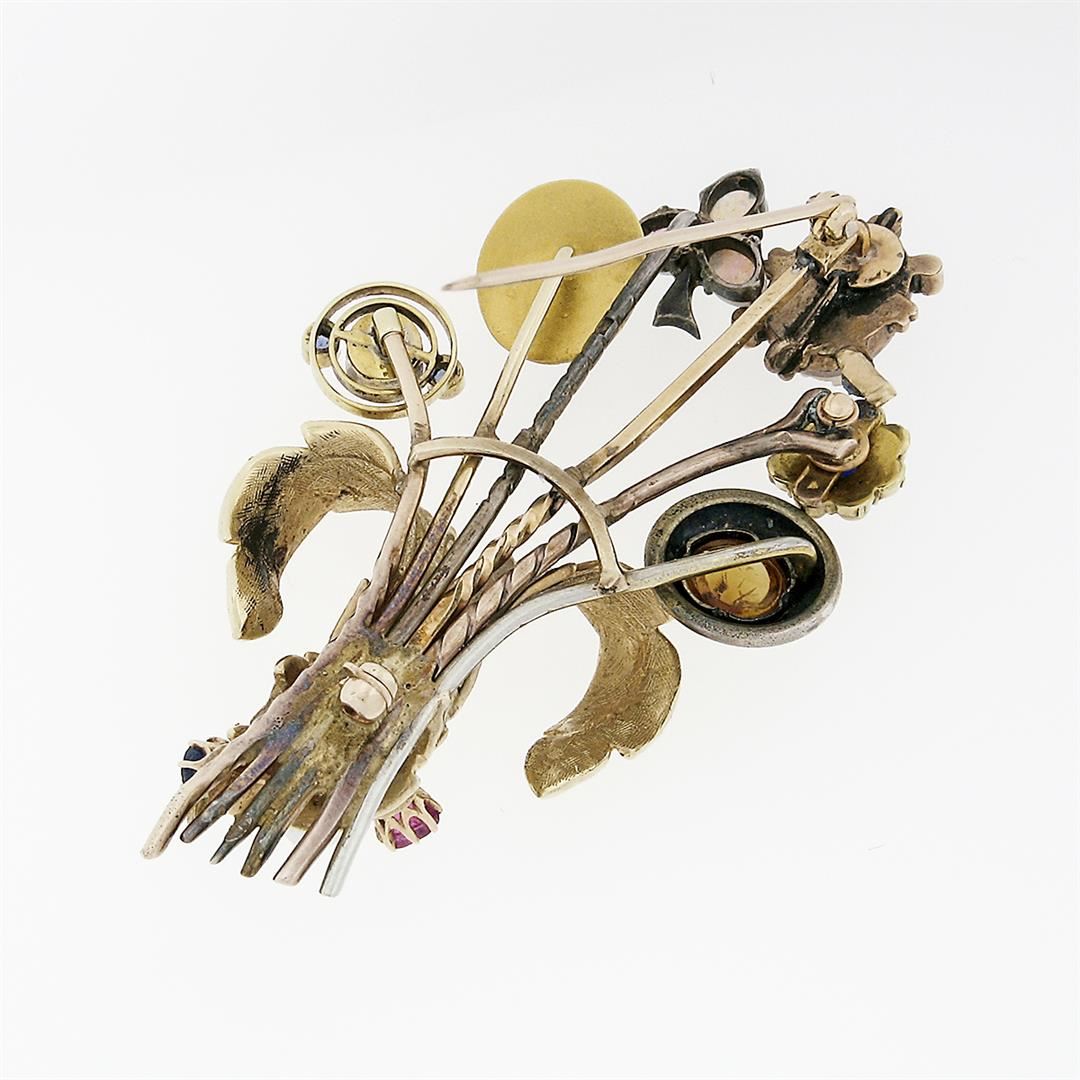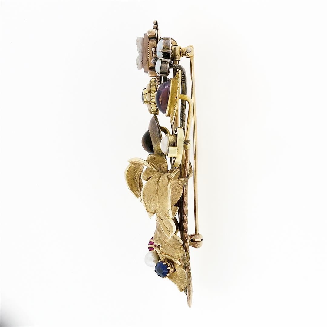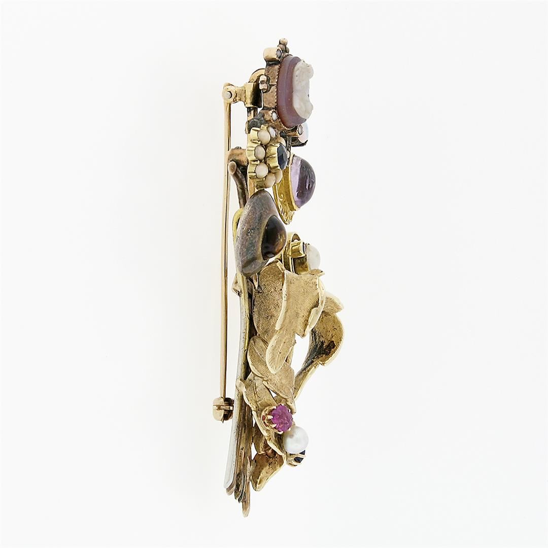 An antique victorian 10, 14 & 19 yellow gold with 900 & 925 silver pin brooch, featuring 1 round cabochon natural citrine (5.8mm), 1 oval cabochon cut natural amethyst (7.82x5.68mm), 3 oval cabochon cut natural opals (4.25x3.38mm), 2 old oval cut natural sapphires (3.23x2.88mm), 1 old oval cut natural ruby (3.67x2.95mm ), 1 round shape cultured pearl (3.84mm ), 1 round shape cultured mabe pearl (4.01mm), 2 old round cut natural sapphires (2.03mm), 13 round shape natural seed pearls (2.1mm and 1.2mm), & 1 oval carved cameo natural agate (9.65x7.31mm). Measures 65.80x34.95mm and weighs a total of 16.04 grams.