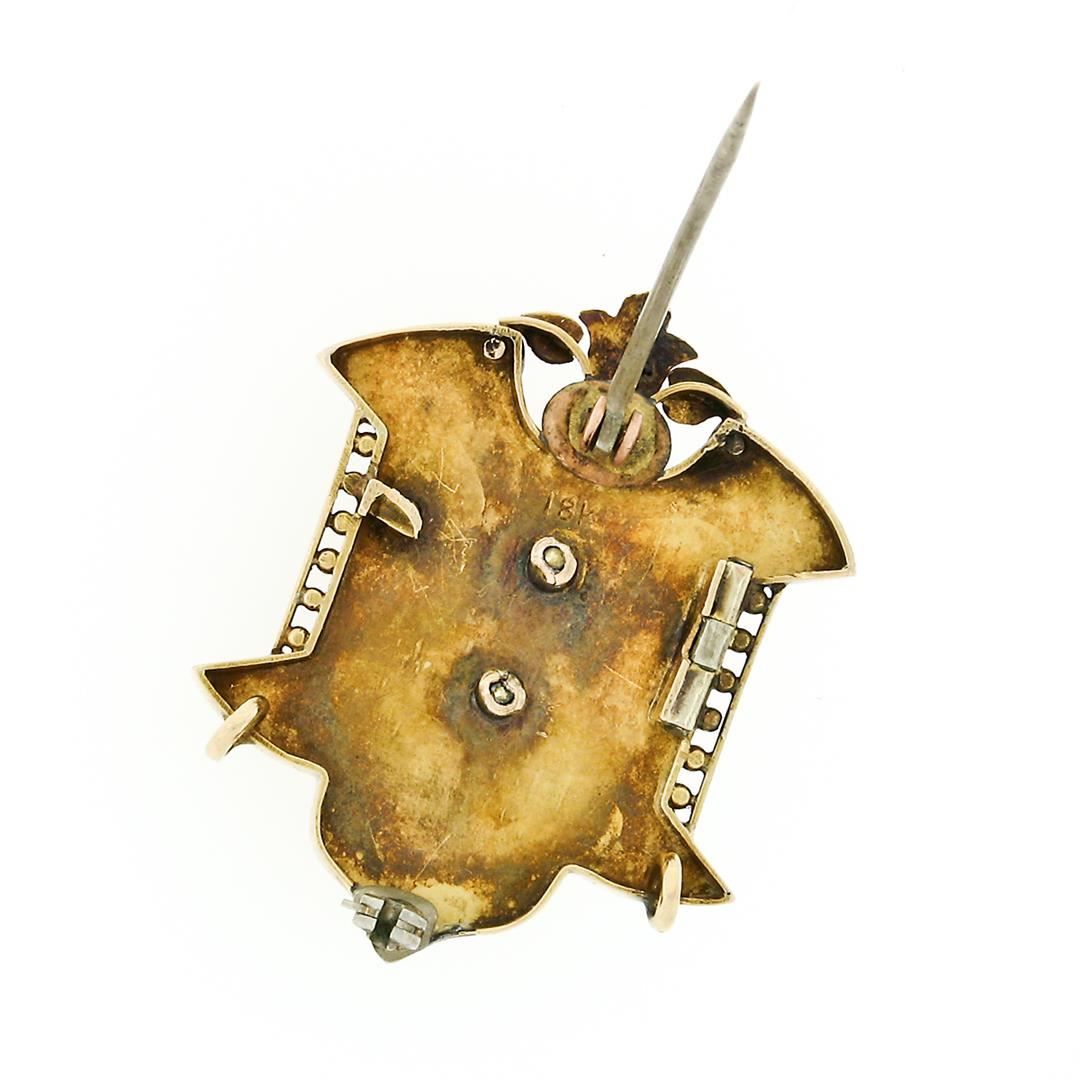 A Victorian solid 18k yellow gold pin brooch, with black enamel work and 3 round shape natural seed pearls (2.8mm). Measures 38.33x31.07mm and weighs a total of 13.90 grams.