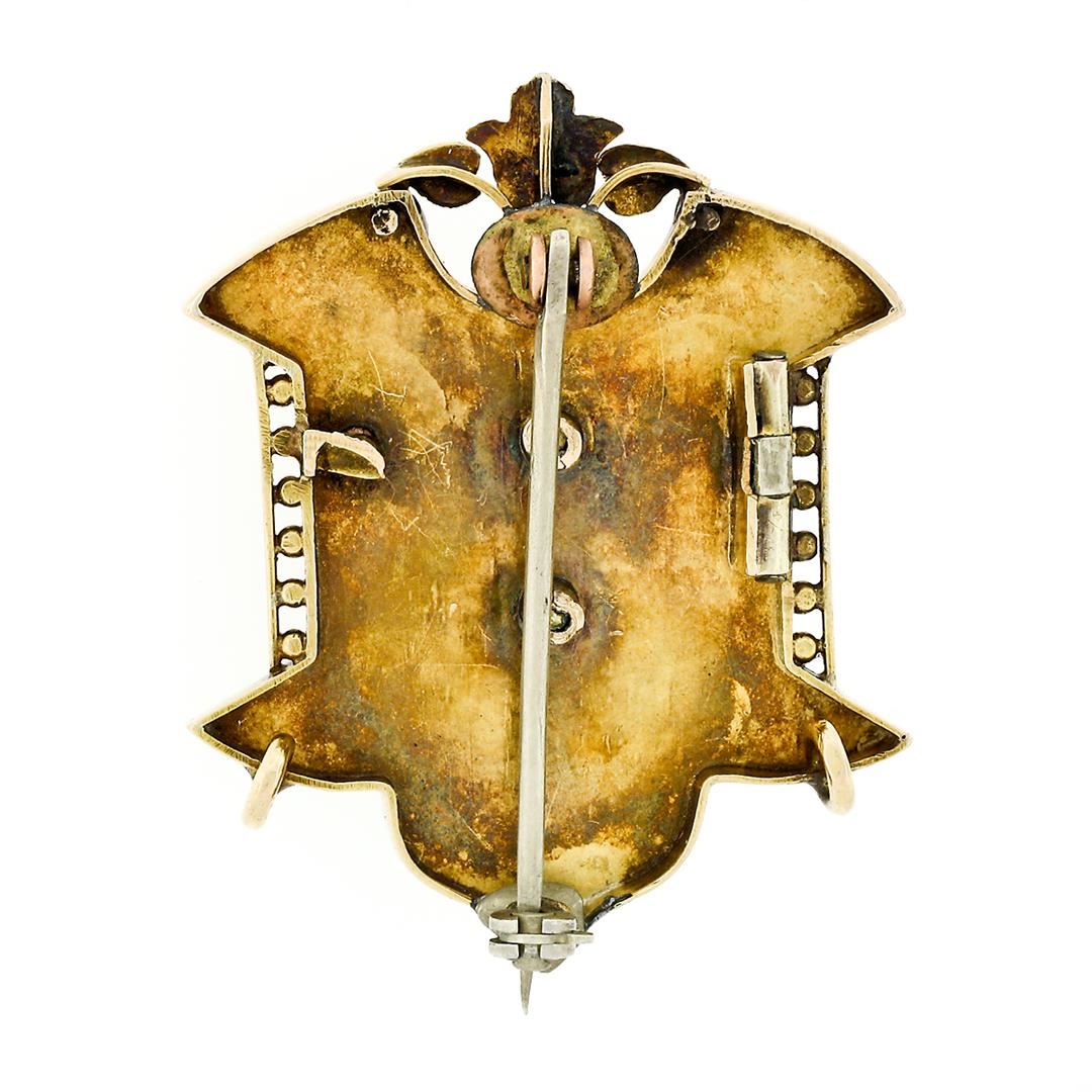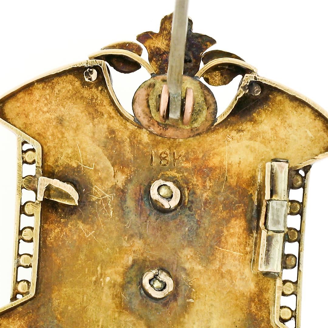 A Victorian solid 18k yellow gold pin brooch, with black enamel work and 3 round shape natural seed pearls (2.8mm). Measures 38.33x31.07mm and weighs a total of 13.90 grams.