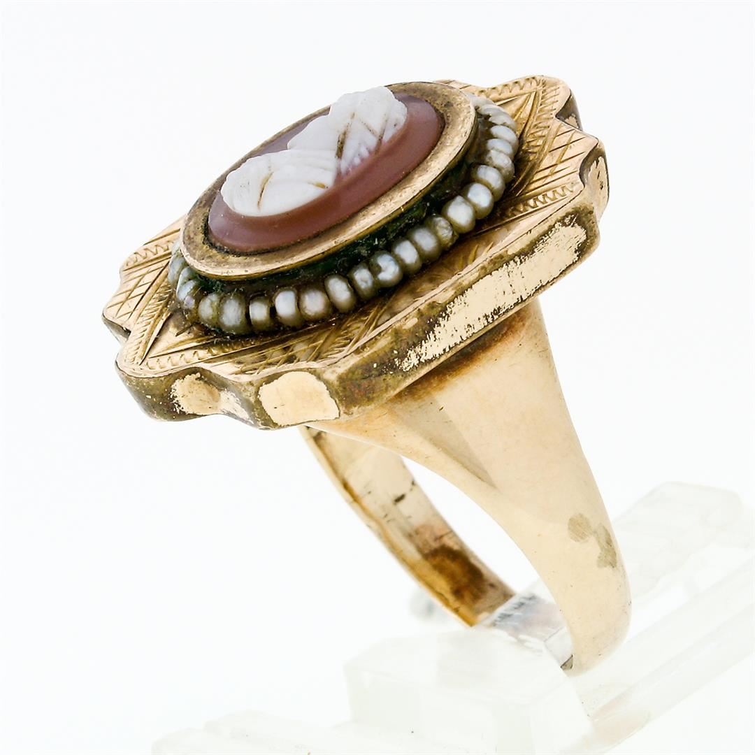 A Victorian solid 10k yellow gold cameo ring, with 1 oval shape carved agate (11.73x8.77mm), surrounded with 40 oval bead shape natural seed pearls (1.50x0.85mm). The ring is size 9.0, weighs a total of 12.82 grams, and measures 24.88mm wide.