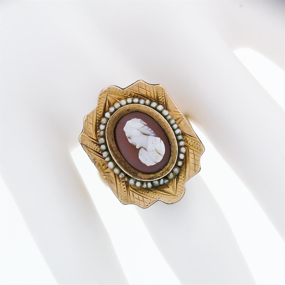 A Victorian solid 10k yellow gold cameo ring, with 1 oval shape carved agate (11.73x8.77mm), surrounded with 40 oval bead shape natural seed pearls (1.50x0.85mm). The ring is size 9.0, weighs a total of 12.82 grams, and measures 24.88mm wide.