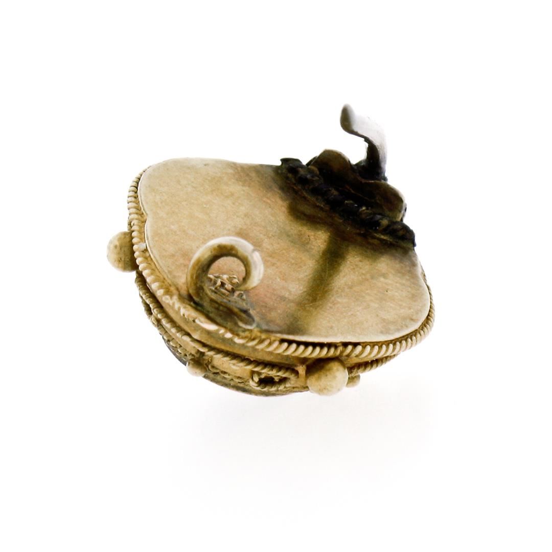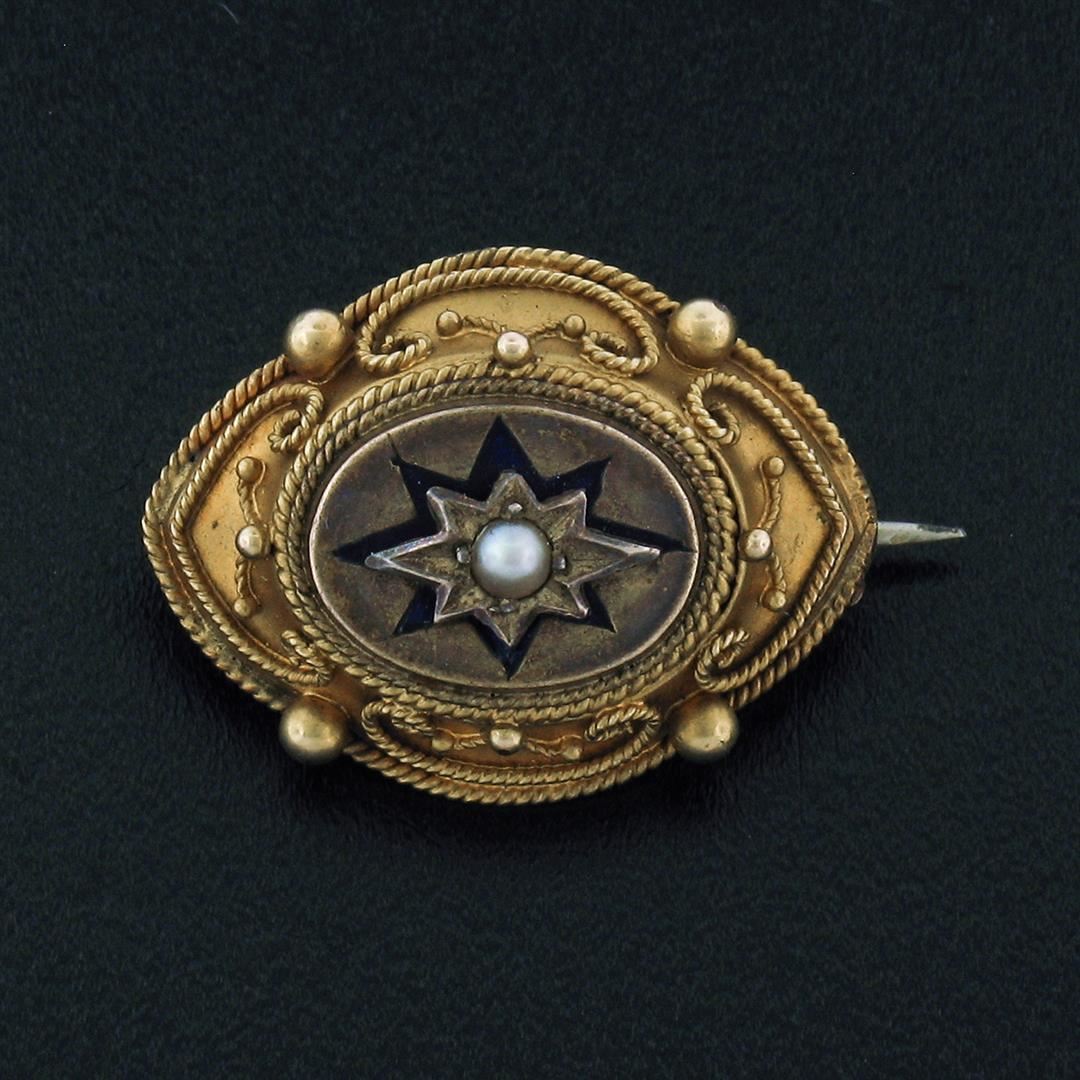 An antique solid 14k yellow gold puffed twistted wire brooch, with 1 round shape natural seed pearl (2.25mm). Measures 15.60x20.40mm and weighs a total of 2.47 grams.