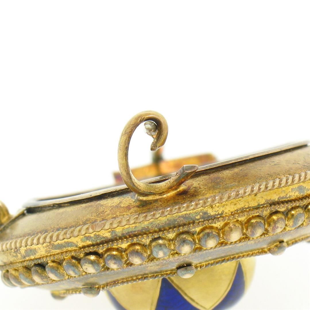 Antique Victorian Etruscan 15k Solid Gold Hair Picture Locket Brooch Pin Pendant. Please see photos and description for all available information. An antique victorian solid 15k yellow gold locket brooch pendant, featuring blue enamel work and 1 natural genuine pearl (3.4mm). Measures 30.5mm in diameter and weighs a total of 9.6 grams.