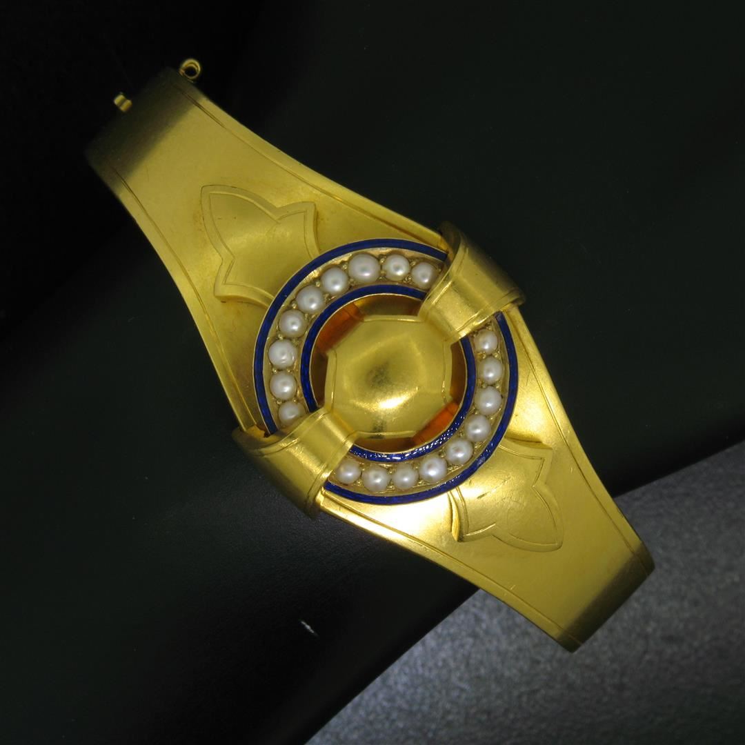 An antique victorian solid 18k gold bangle bracelet, with 18 natural pearls (2.0-2.25mm) and blue enamel work. It weighs a total of 20.65 grams, measures 25.60mm wide, and measures 6 inches in length.