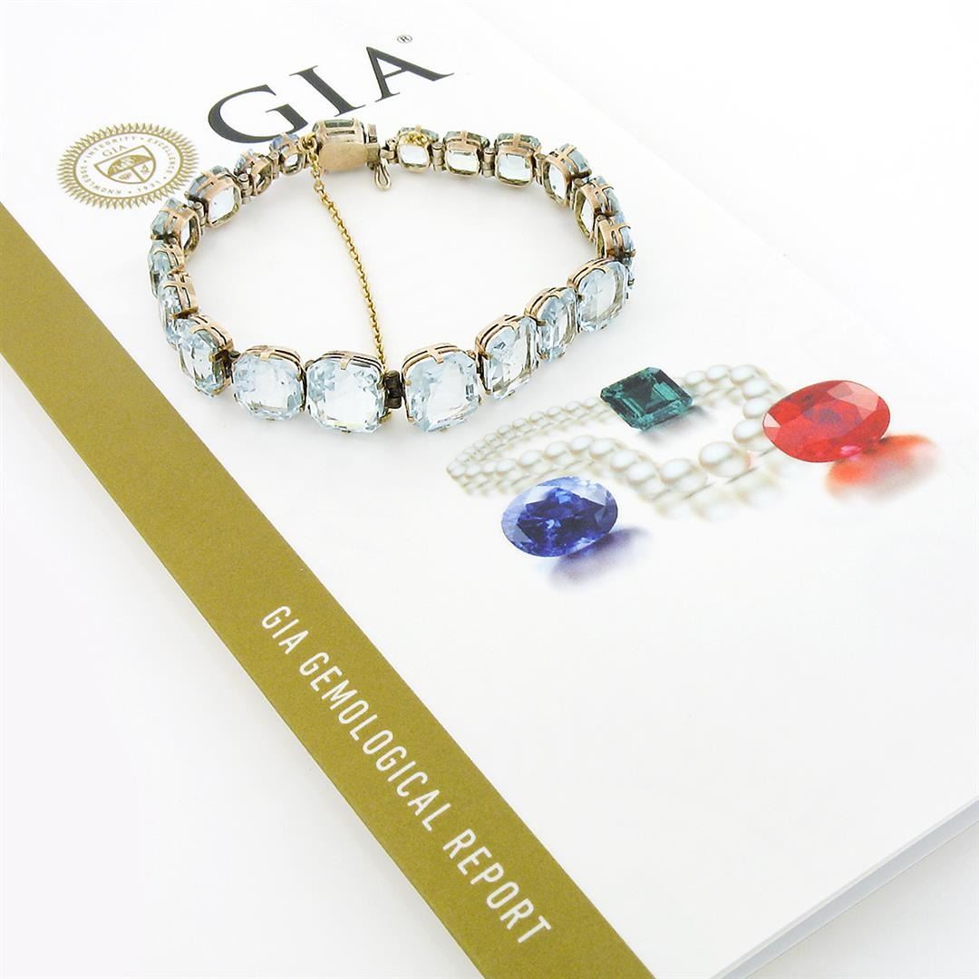 An antique victorian solid 8k yelllow gold line bracelet, with 20 Gia certified various hand cut shapes natural aquamarines (25ctw) It weighs a total of 14.53 grams, measures 10.79mm wide, and measures 6.25 inches in length. Comes with all original relevant certifications.