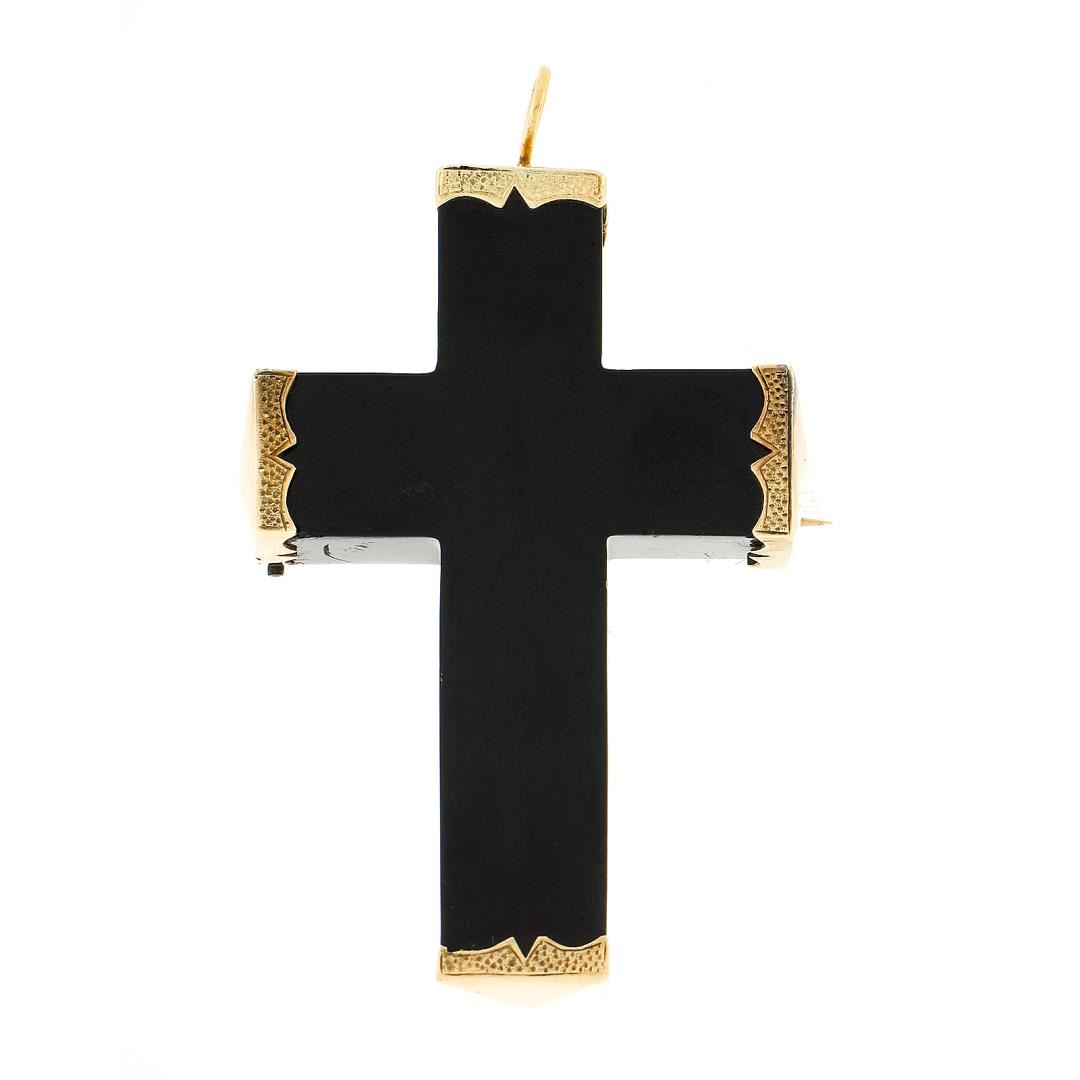 An antique solid 10k yellow gold cross brooch pendant, featuring 1 cross shape natural black jet (44x29.4mm ). The pendant weighs a total of 8.90 grams, measures 54.40x32.40mm including the bail, and the inside of the bail measures 5.3mm.