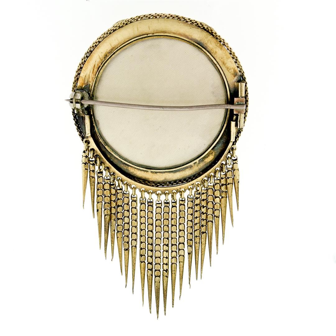 A Victorian era solid 14k yellow gold brooch with 22 dangling chains adorend with 1 round (7.25mm) and 12 oval synthetic stones (5.90x4.35mm; 8.60x6.20mm). Measures 77.76x43.63mm and weighs a total of 29.36 grams.