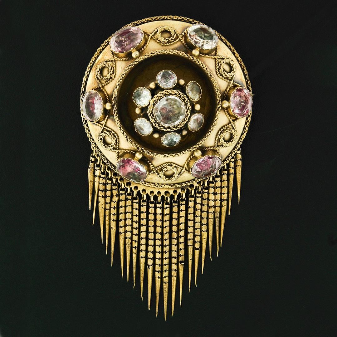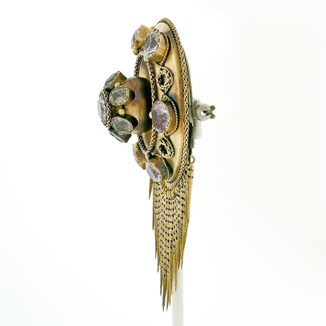 A Victorian era solid 14k yellow gold brooch with 22 dangling chains adorend with 1 round (7.25mm) and 12 oval synthetic stones (5.90x4.35mm; 8.60x6.20mm). Measures 77.76x43.63mm and weighs a total of 29.36 grams.