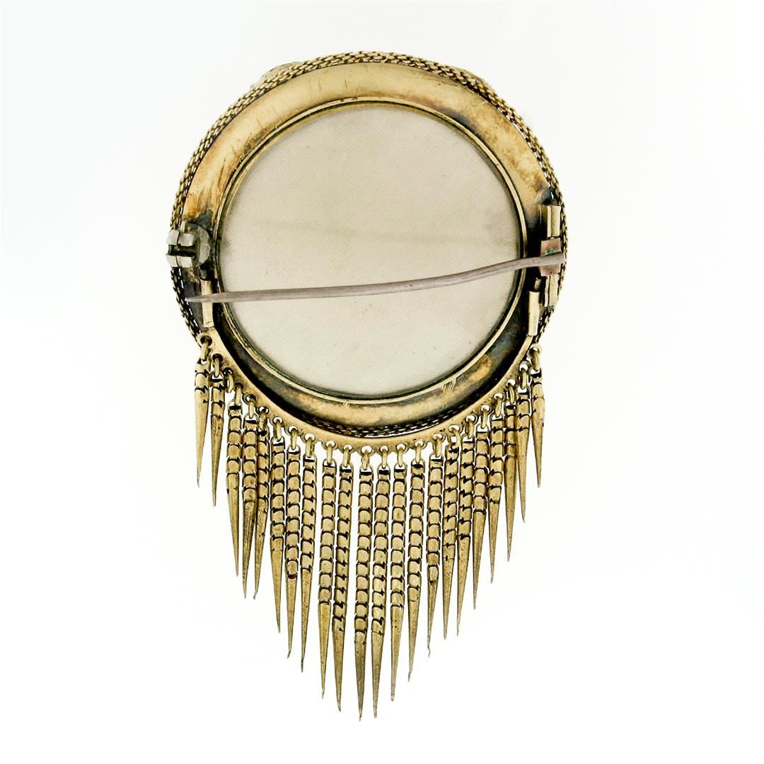 A Victorian era solid 14k yellow gold brooch with 22 dangling chains adorend with 1 round (7.25mm) and 12 oval synthetic stones (5.90x4.35mm; 8.60x6.20mm). Measures 77.76x43.63mm and weighs a total of 29.36 grams.