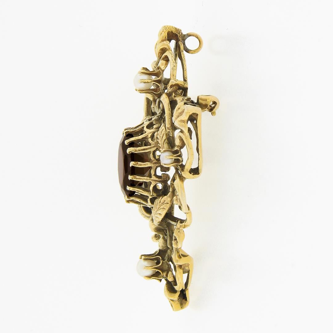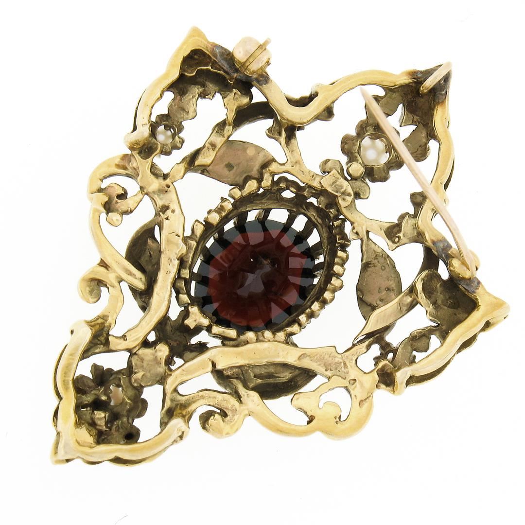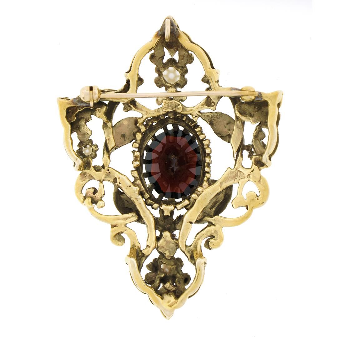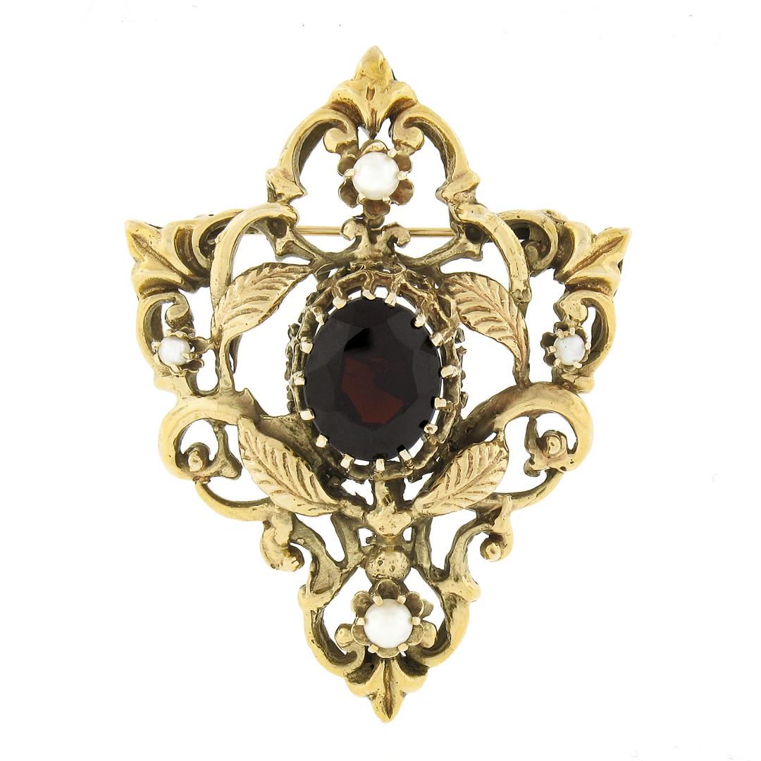 An antique solid 14k yellow gold brooch pendant, with 1 oval brilliant cut natural garnet (12.5x10.5mm), and 4 round shape cultured pearls (2.5mm to 3.7mm each). Measures 51.40x38.50mm and weighs a total of 15.47 grams. and the inside of the bail measures 2.4mm.