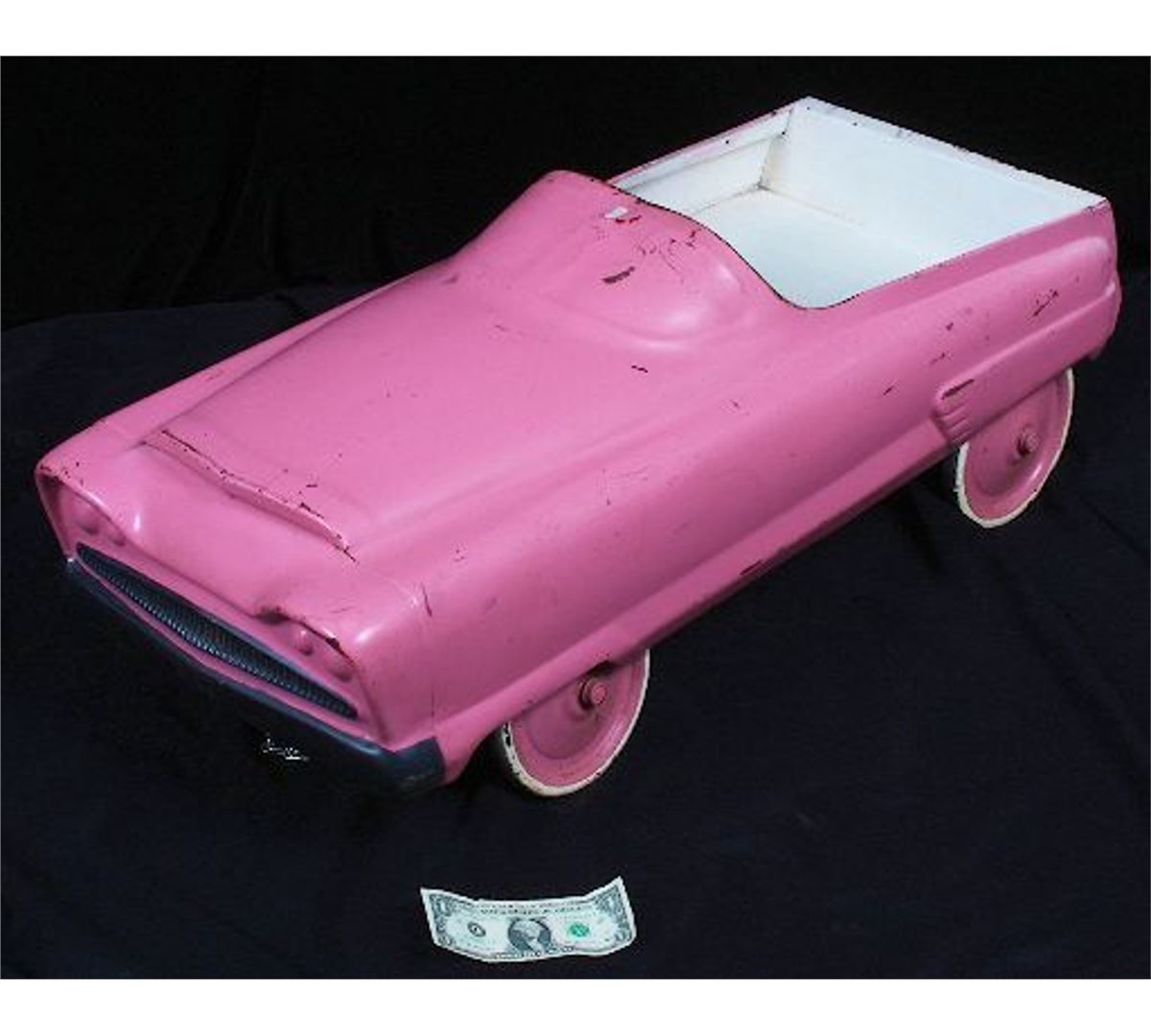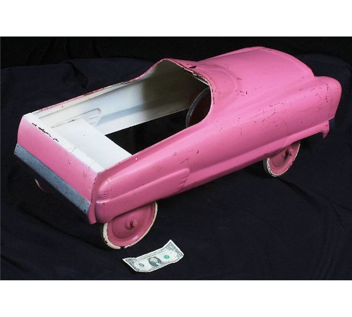 Antique Vintage Pink Pedal Car c.1930-50's. Awesome Collector's Item. As-Is Condition. Measures 3' long, 15" wide and weighs 20lbs. Dollar bill in photo is to demonstrate size of the pedal car, it is not included.