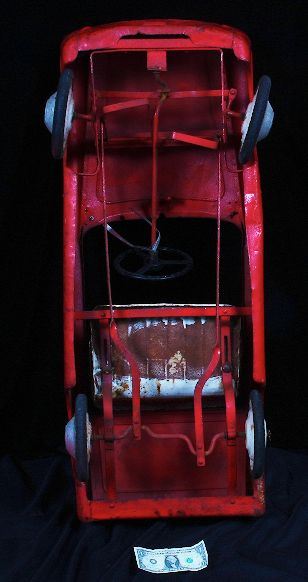 Antique Vintage Red Pedal Car c.1930-50's. Awesome Collector's Item. As-Is Condition. Measures 42" long, 18" wide and weighs 25lbs. Dollar bill in photo is to demonstrate size of the pedal car, it is not included.