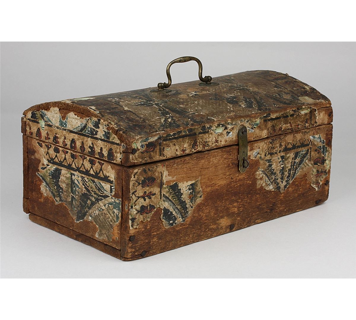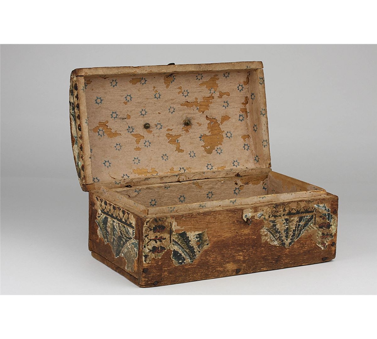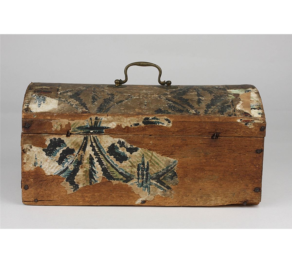 One antique pine wallpaper box circa 1800s. The box features handmade square nail heads, original brass handle and catch and domed with original brass hardware! Very Collectible! Measures 12" W x 5.5" H x 6.75" D. Valued between $900 - $950.