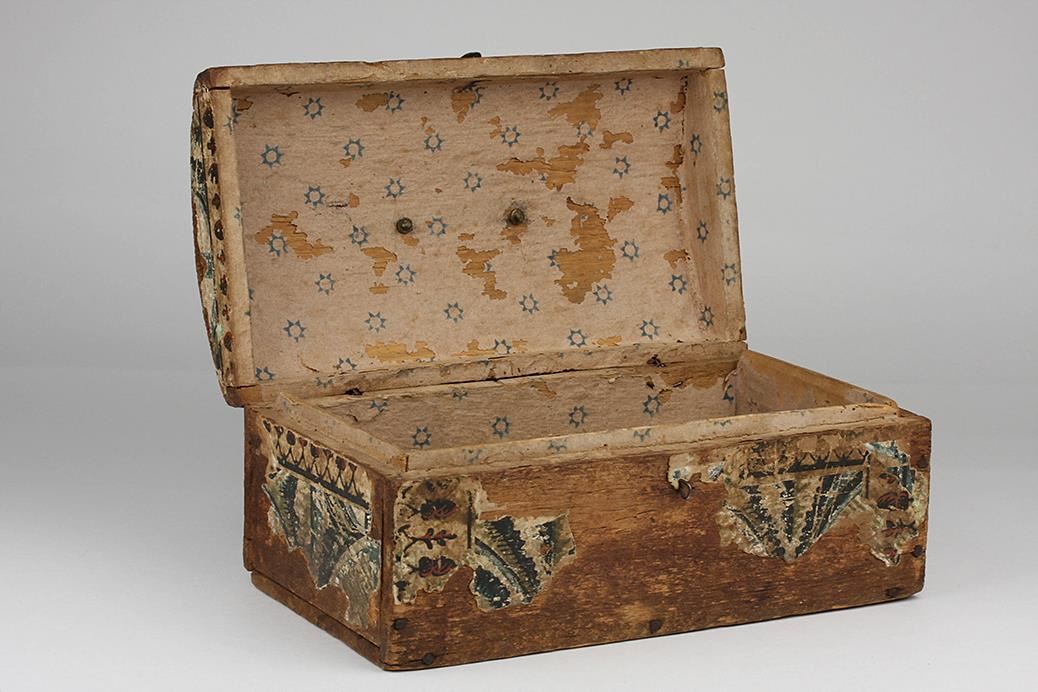 One antique pine wallpaper box circa 1800s. The box features handmade square nail heads, original brass handle and catch and domed with original brass hardware! Very Collectible! Measures 12" W x 5.5" H x 6.75" D. Valued between $900 - $950.