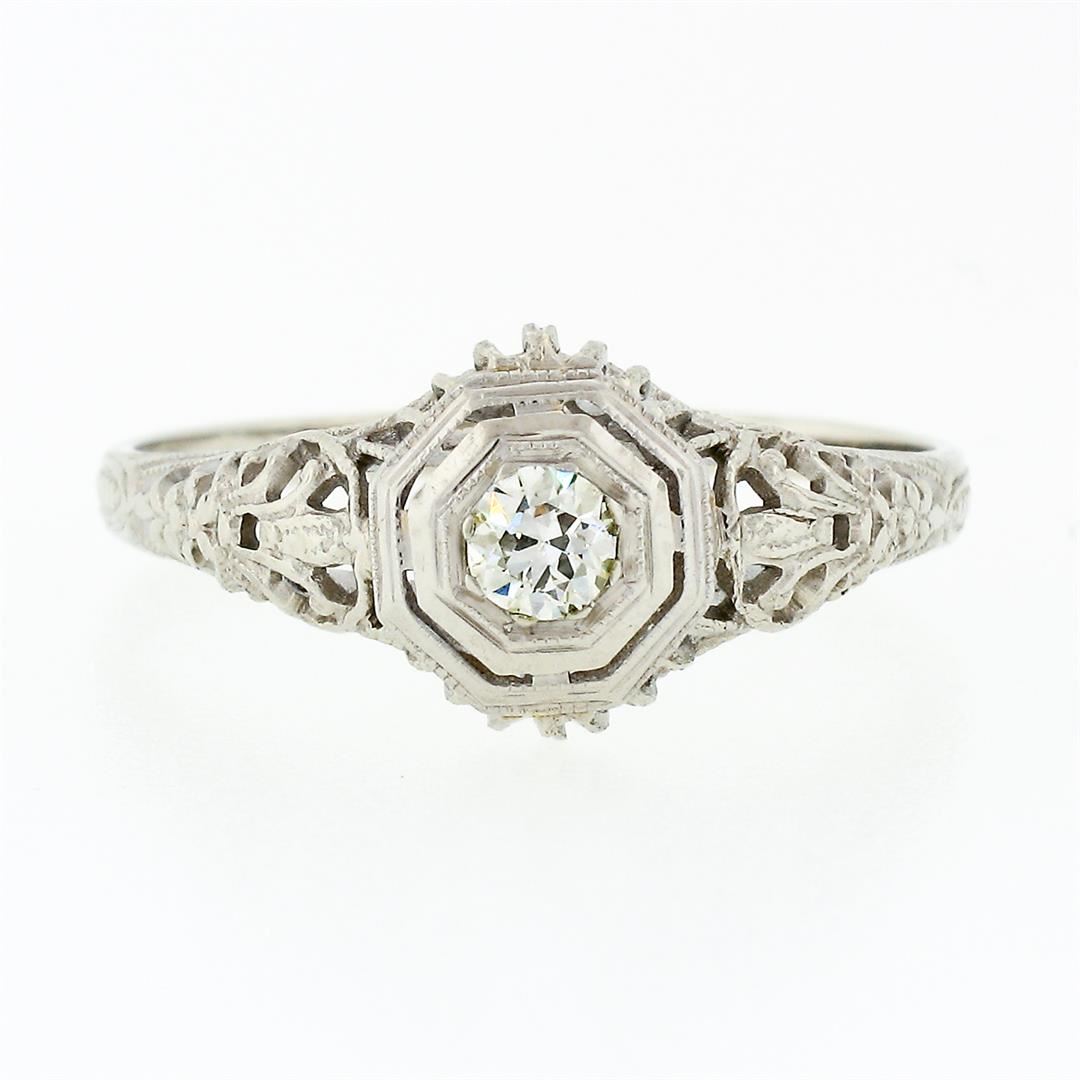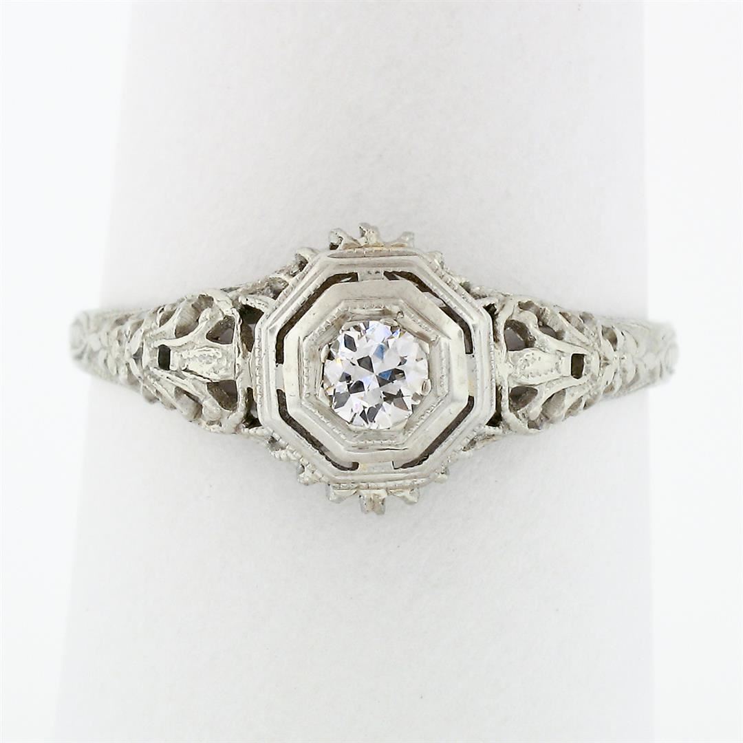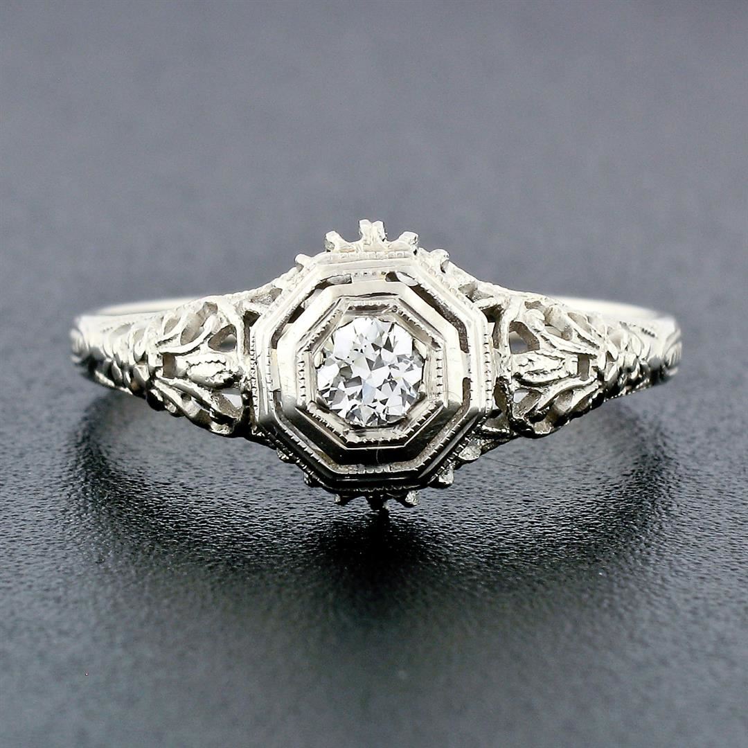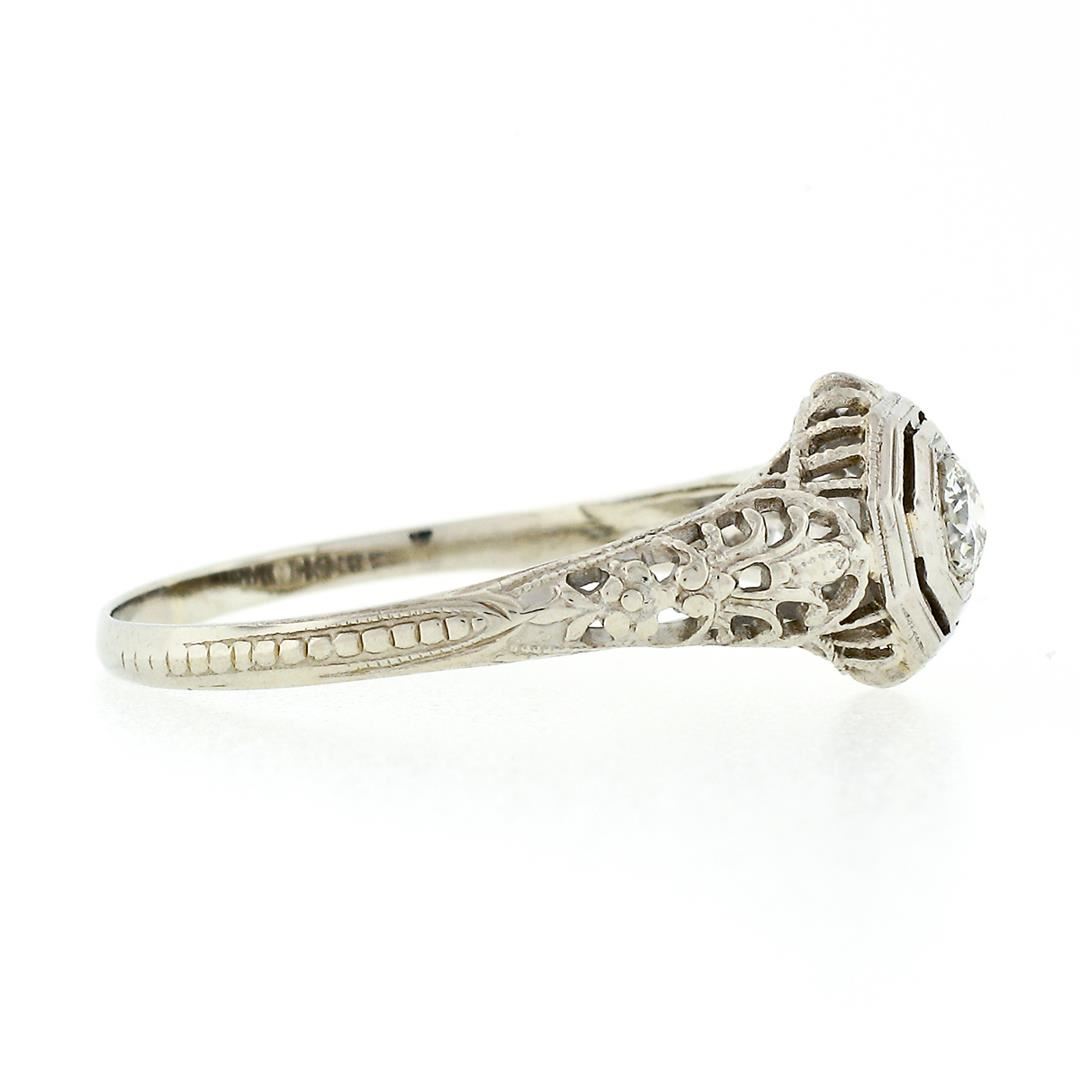 An art deco period solid 18k white gold engagement ring, with 1 round transitional cut natural diamond (G - VVS2; 0.18ct), and filigree work. The ring is size 8.0, weighs a total of 2.00 grams, and measures 9.06mm wide.