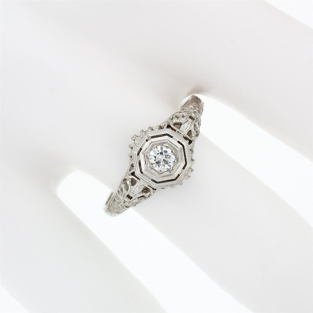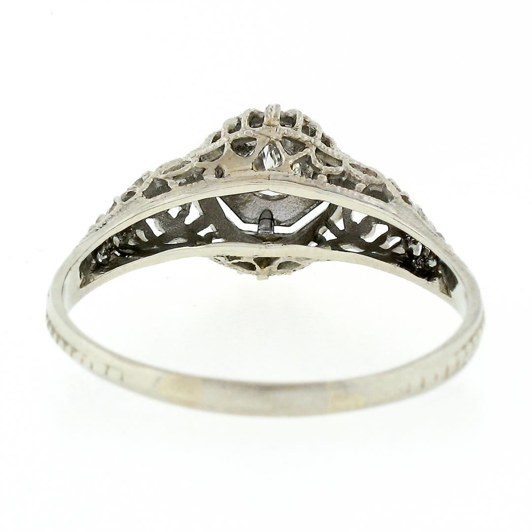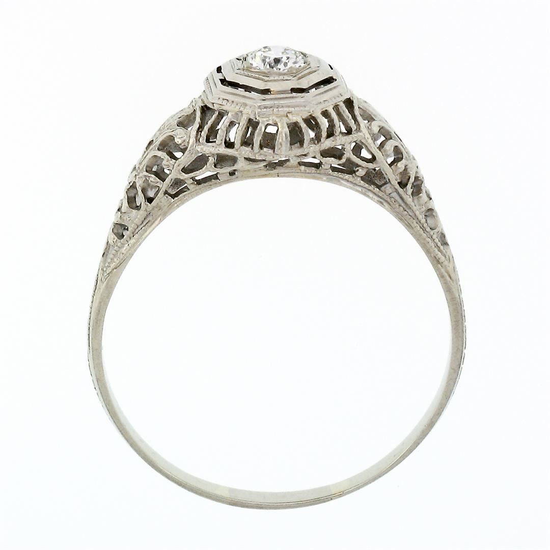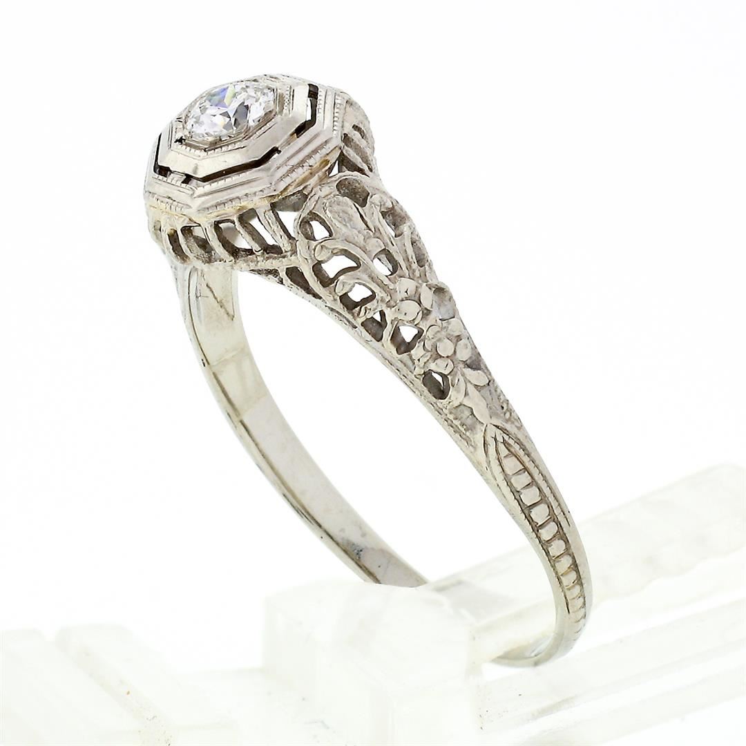 An art deco period solid 18k white gold engagement ring, with 1 round transitional cut natural diamond (G - VVS2; 0.18ct), and filigree work. The ring is size 8.0, weighs a total of 2.00 grams, and measures 9.06mm wide.