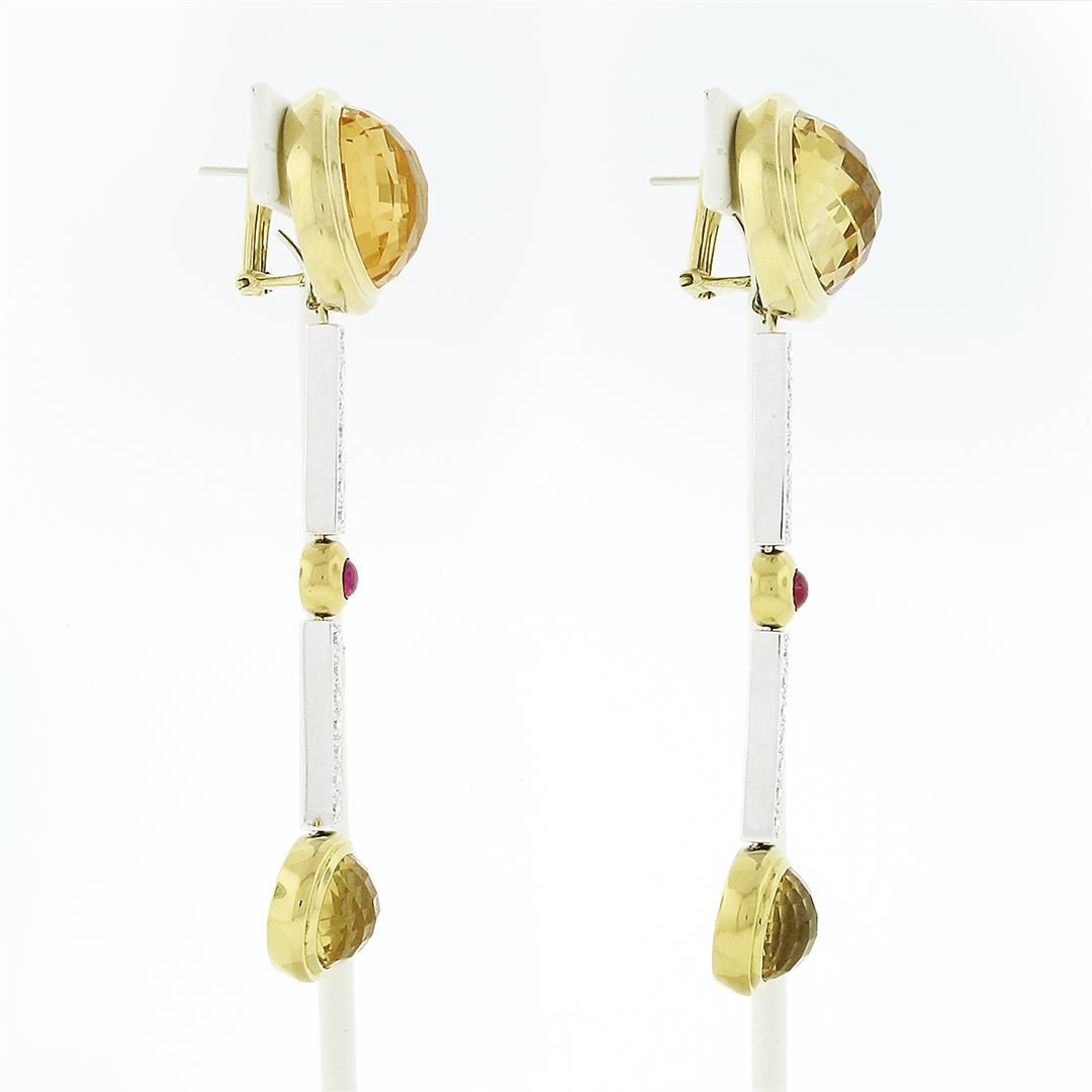 A solid 18k yellow & white gold long dangle day night earrings by Antonini, featuring 4 round checkerboard domed rose cut natural citrines (15.1mm and 9.6mm), 2 round cabochon cut natural rubies (3.2mm), and 28 round brilliant cut natural diamonds (F/G - VVS2/VS1 ; 1.12ctw). The earrings measure approximately 74.1x19.1mm and weigh a total of 27.19 grams.