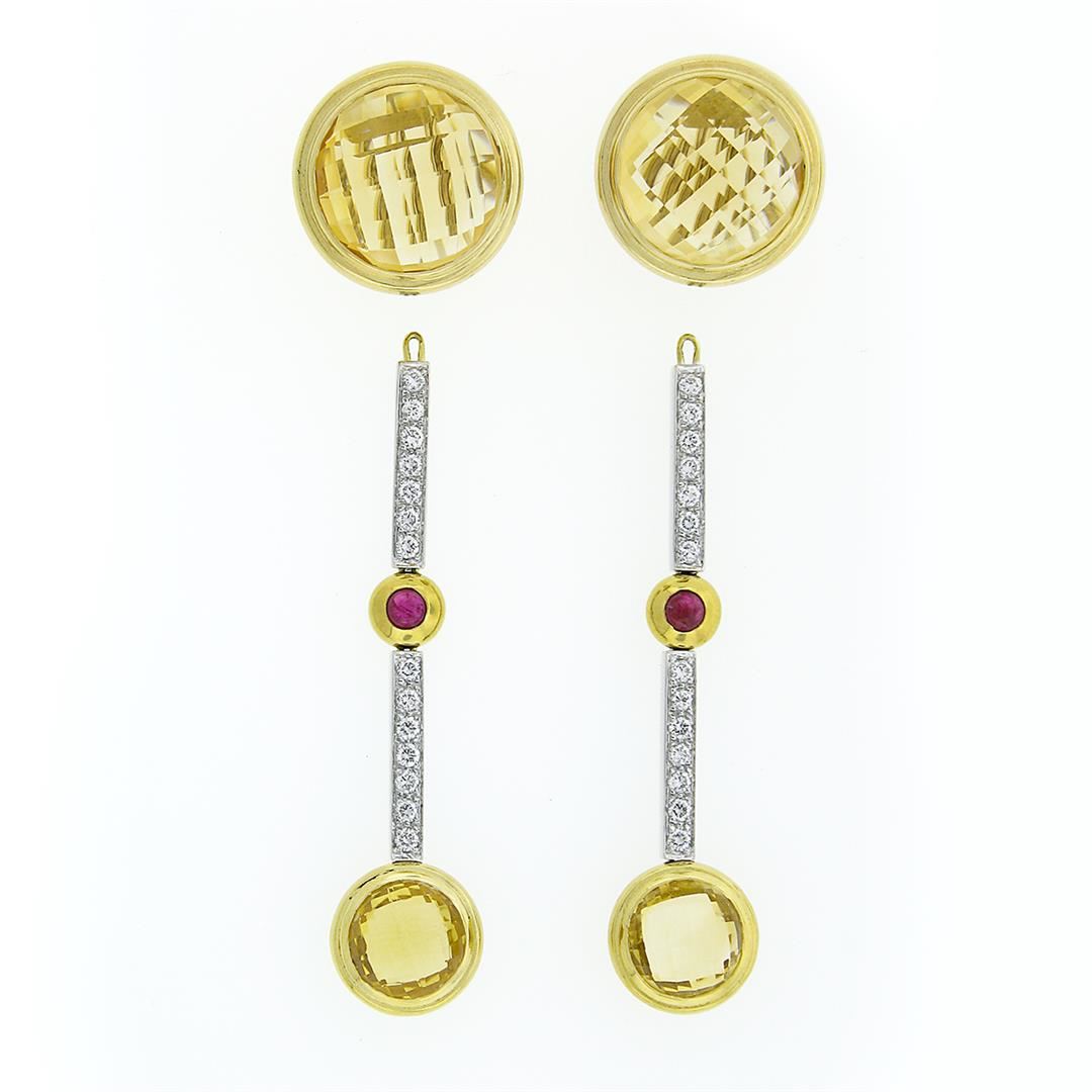 A solid 18k yellow & white gold long dangle day night earrings by Antonini, featuring 4 round checkerboard domed rose cut natural citrines (15.1mm and 9.6mm), 2 round cabochon cut natural rubies (3.2mm), and 28 round brilliant cut natural diamonds (F/G - VVS2/VS1 ; 1.12ctw). The earrings measure approximately 74.1x19.1mm and weigh a total of 27.19 grams.