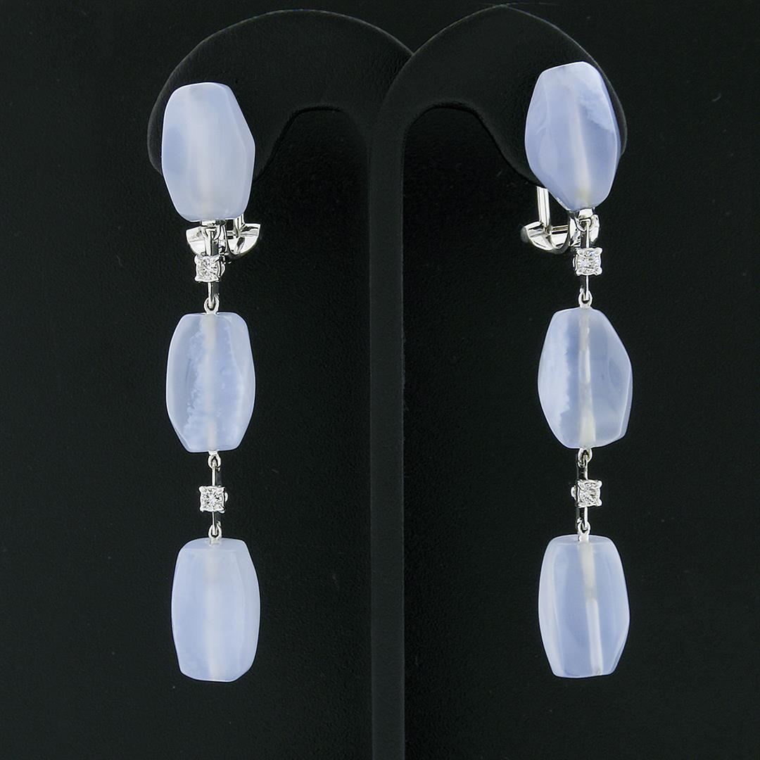 A solid 18k white gold long dangle drop earrings by Antonini, featuring 6 freeform faceted bead cabochon cut natural chalcedony (14.1x9.5mm), and 4 round brilliant cut natural diamonds (G/H - VS1/VS2 ; 0.15ctw). The earrings height measure approximately 61.80mm and weigh a total of 15.10 grams.