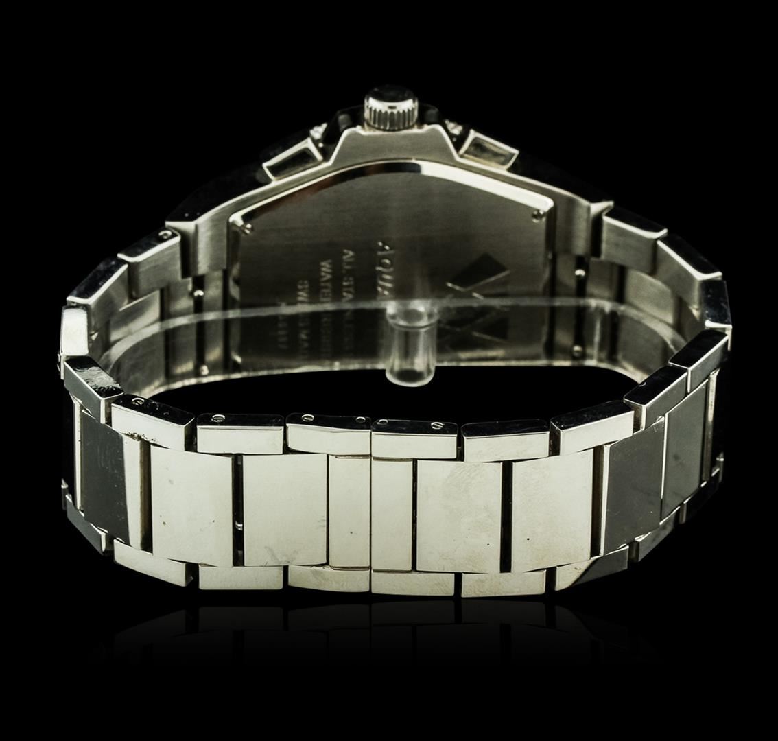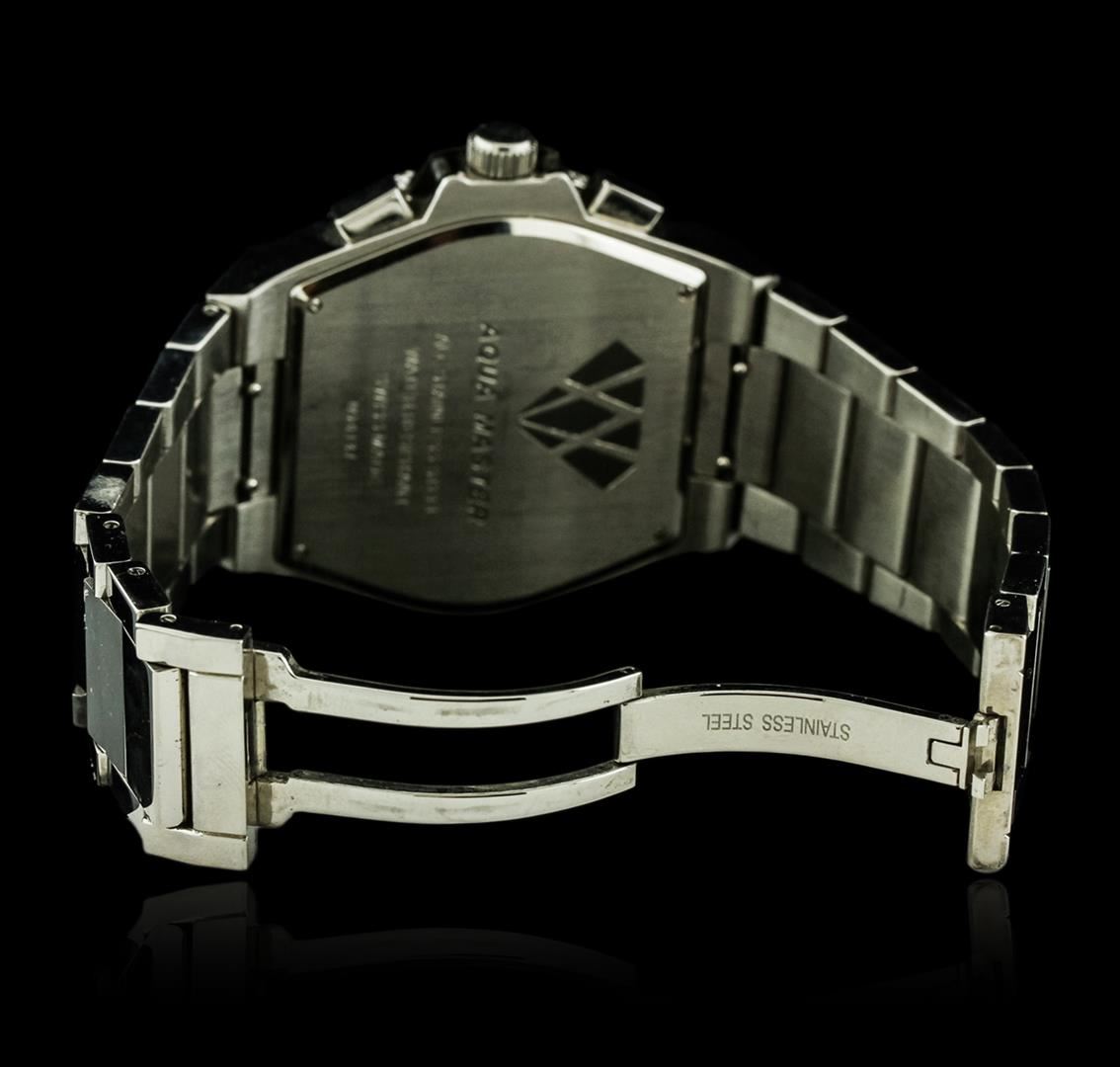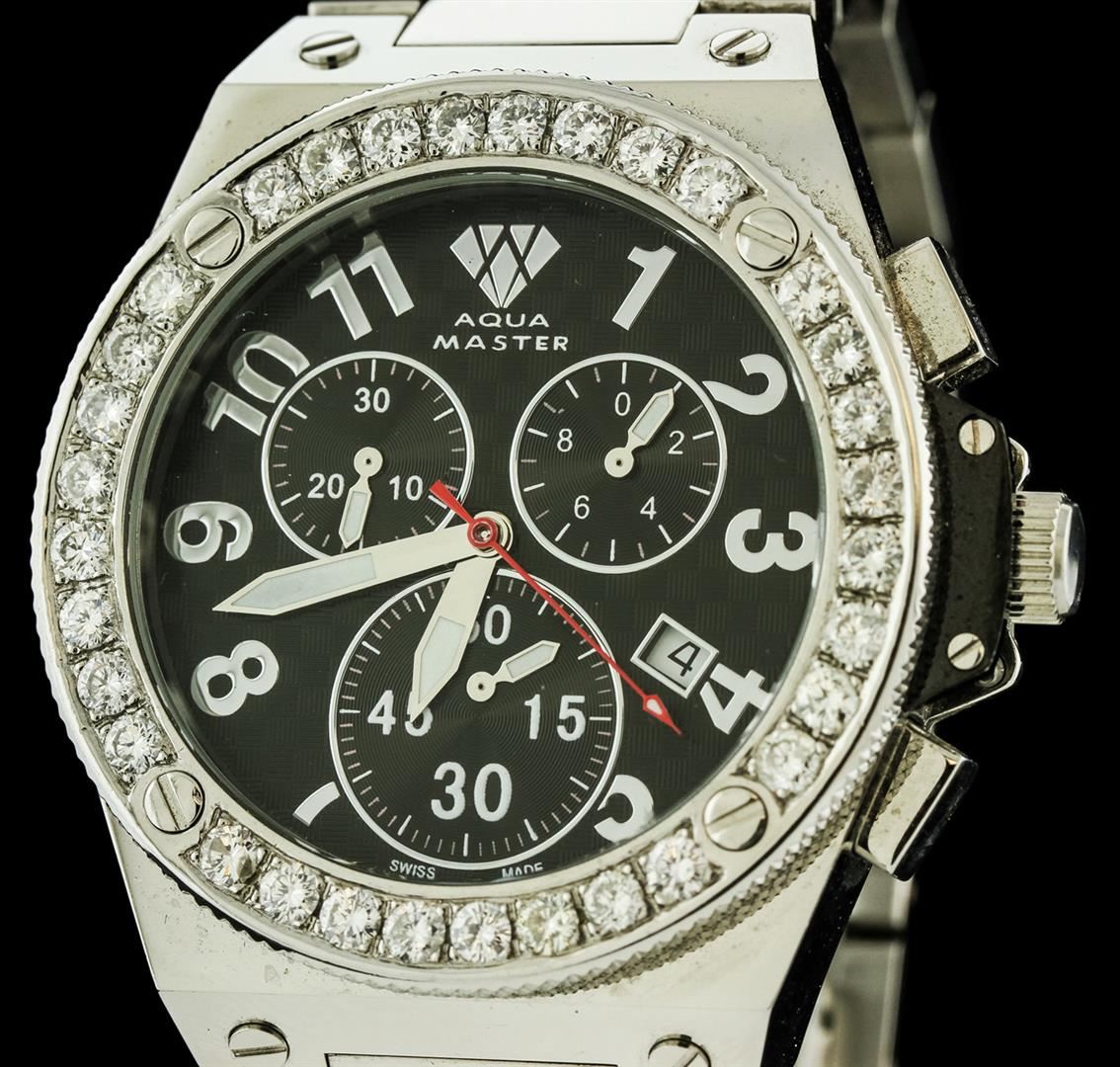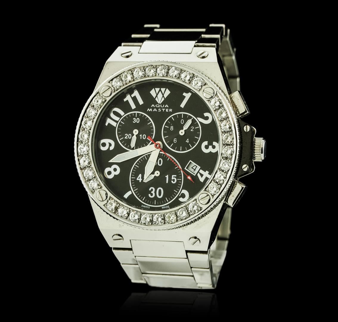 One Aqua Master wristwatch featuring: Case: Stainless steel. Crown: Stainless steel. Bezel: Stainless steel set with diamonds, rotating. Dial: Black with luminous hands and chronograph function. Date window located at the 4 o'clock position. Bracelet: Stainless steel. Water resistant.