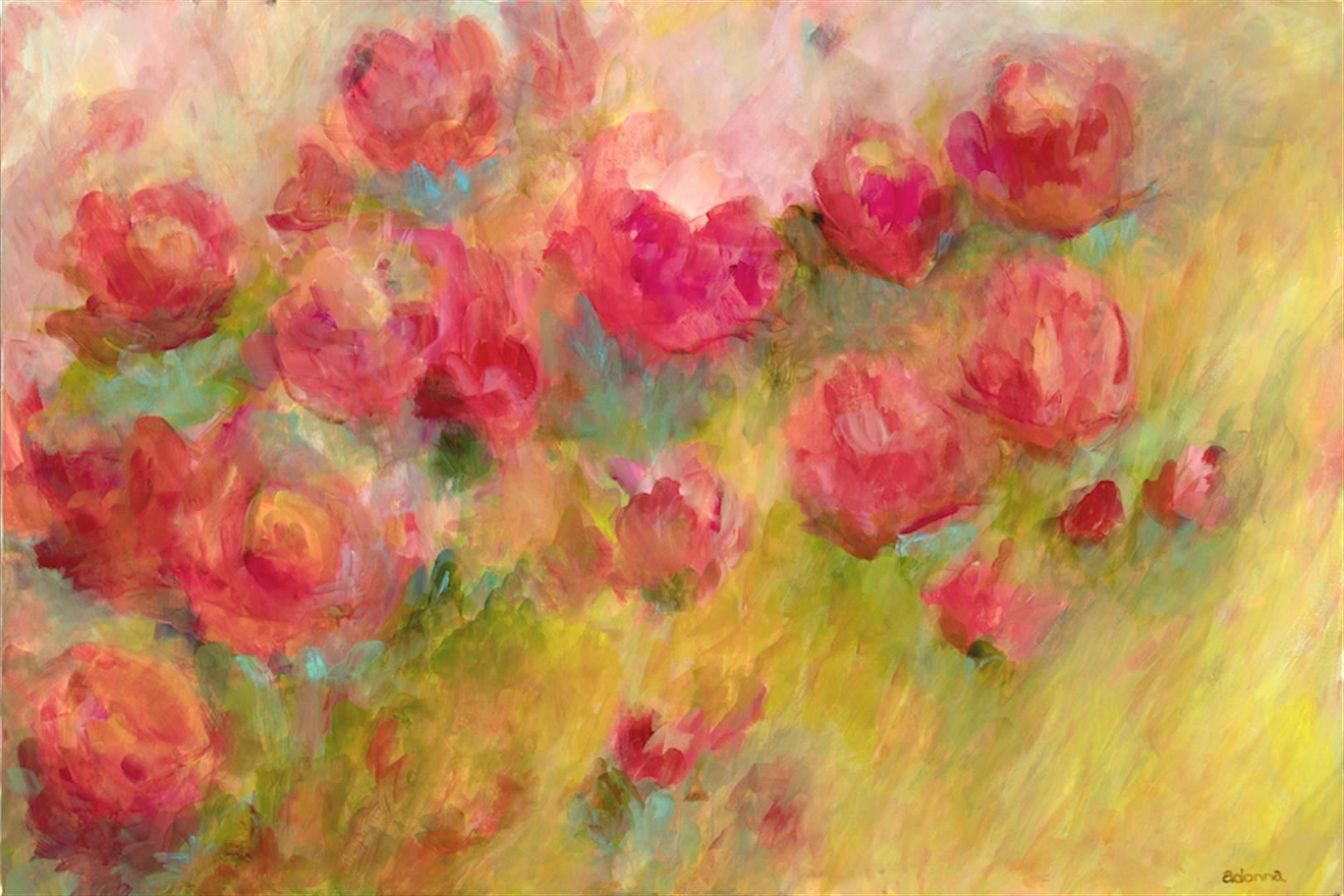 Soft and serene, this beautiful cluster of pink & red flowers is an original Acrylic/ oil pastel on 36x24" stretched canvas by Adonna.