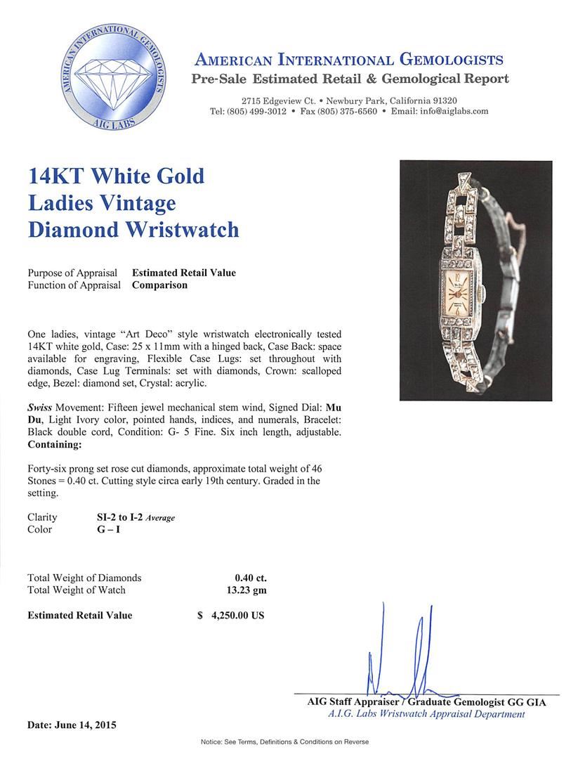 One ladies, vintage "Art Deco" style wristwatch electronically tested 14KT white gold, Case: 25 x 11mm with a hinged back, Case Back: space available for engraving, Flexible Case Lugs: set throughout with diamonds, Case Lug Terminals: set with diamonds, Crown: scalloped edge, Bezel: diamond set, Crystal: acrylic. Swiss Movement: Fifteen jewel mechanical stem wind, Signed Dial: Mu Du, Light Ivory color, pointed hands, indices, and numerals, Bracelet: Black double cord, Condition: G-5 Fine. Six inch length, adjustable. Containing: Forty-six prong set rose cut diamonds, approximate total weight of 46 Stones = 0.40 ct. Cutting style circa early 19th century. Graded in the setting. Clarity: SI-2 to I-2 Average. Color: G - I. Total Weight of Diamonds: 0.40ct. Total Weight of Watch: 13.23 grams. AIG Appraised at $4,250.00.