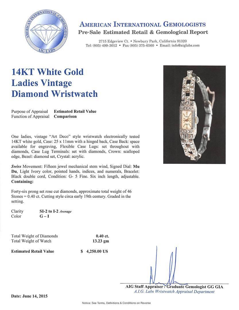 One ladies, vintage "Art Deco" style wristwatch electronically tested 14KT white gold, Case: 25 x 11mm with a hinged back, Case Back: space available for engraving, Flexible Case Lugs: set throughout with diamonds, Case Lug Terminals: set with diamonds, Crown: scalloped edge, Bezel: diamond set, Crystal: acrylic. Swiss Movement: Fifteen jewel mechanical stem wind, Signed Dial: Mu Du, Light Ivory color, pointed hands, indices, and numerals, Bracelet: Black double cord, Condition: G-5 Fine. Six inch length, adjustable. Containing: Forty-six prong set rose cut diamonds, approximate total weight of 46 Stones = 0.40 ct. Cutting style circa early 19th century. Graded in the setting. Clarity: SI-2 to I-2 Average. Color: G - I. Total Weight of Diamonds: 0.40 ct. Total Weight of Watch: 13.23 grams. AIG Appraised.
