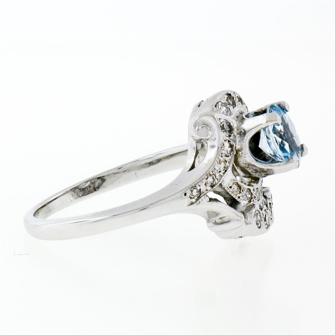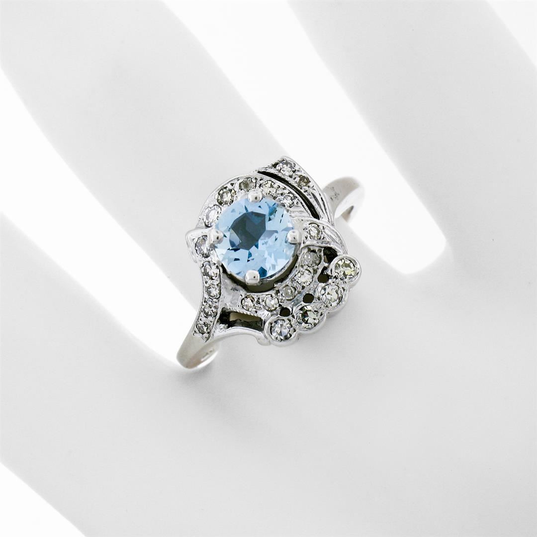 An art deco period 14k white gold cocktail ring with a 1.00ct round aquamarine prong set at the center and 0.45ctw of round single cut diamonds (G to I - VS1/VS2) pave set around it. The ring is size 6.5, weighs a total of 4.55 grams, and measures 13.35m