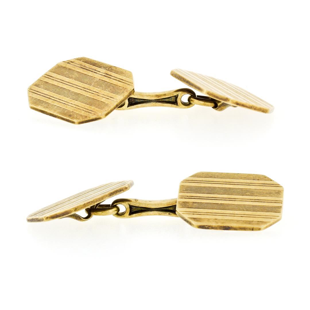 14k yellow gold art deco period cuff links with a fine grooved pattern. These cuff links have a dual panel design with a clearance of 21.85mm, weigh a total of 9.22 grams, and the front panels measure 14.25x12.00mm.