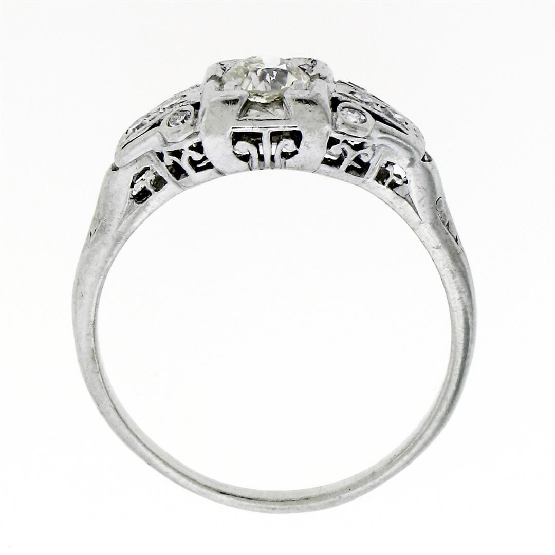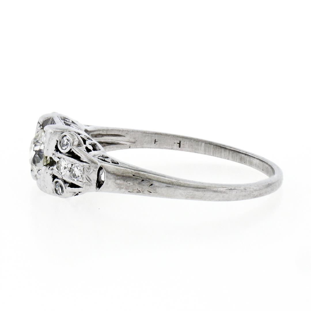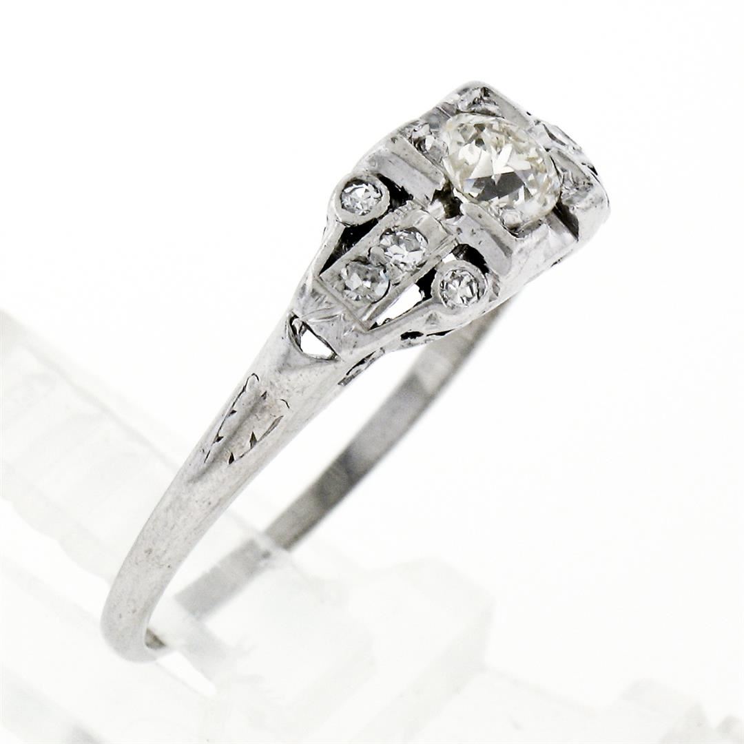 A platinum art deco period ring featuring a 0.30ct old European cut diamond (J - VS2) prong set at its center among 0.20ctw of bezel and pave set round single cut diamonds (G - VS1/VS2). The ring is size 7.0, weighs a total of 3.83 grams, and measures 6.35mm wide.