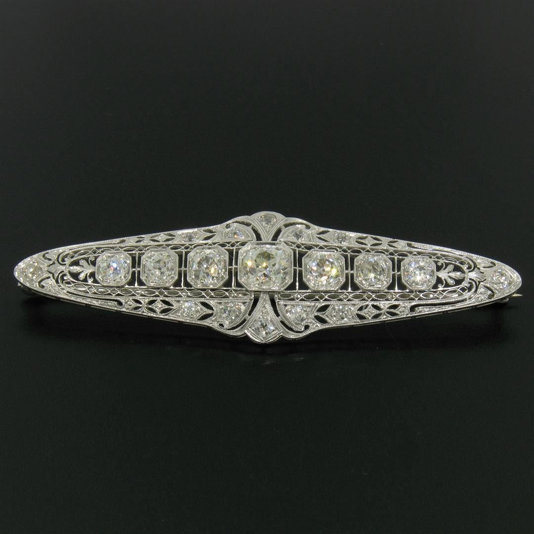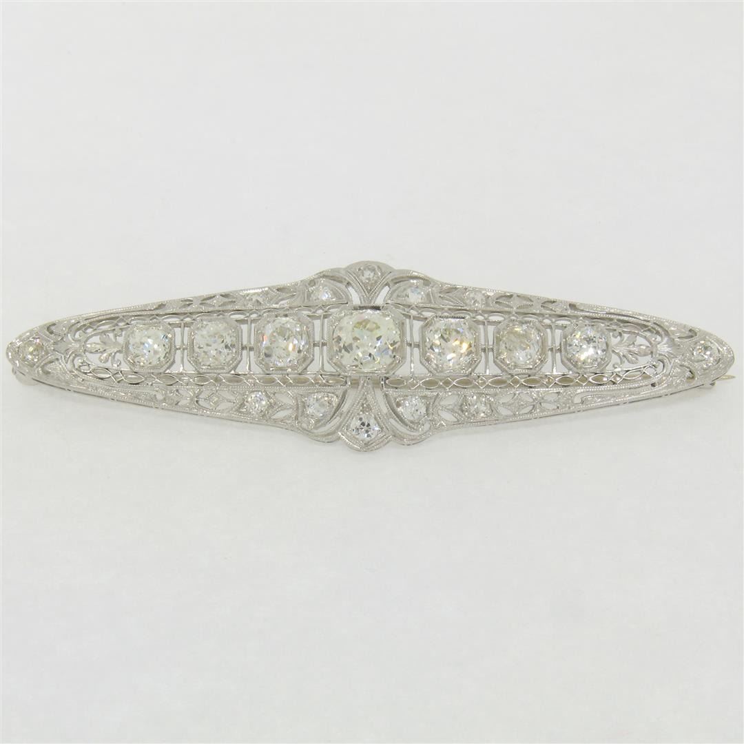 An art deco period platinum filigree brooch with a central 1.58ct old European cut diamond (K - SI1) surrounded by 4.42ctw of European and mine cut diamonds (G to I - VS2 to SI2). Measures 21.10x75.05mm and weighs a total of 12.84 grams.