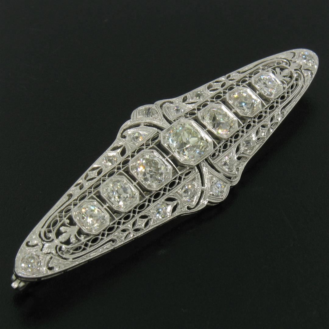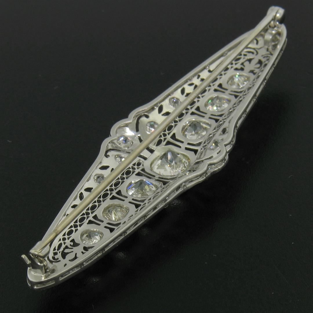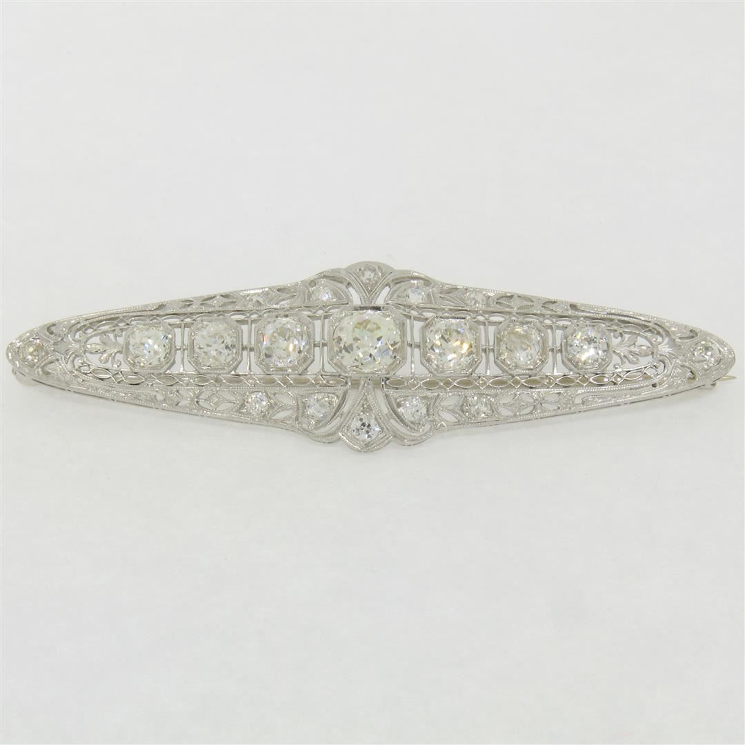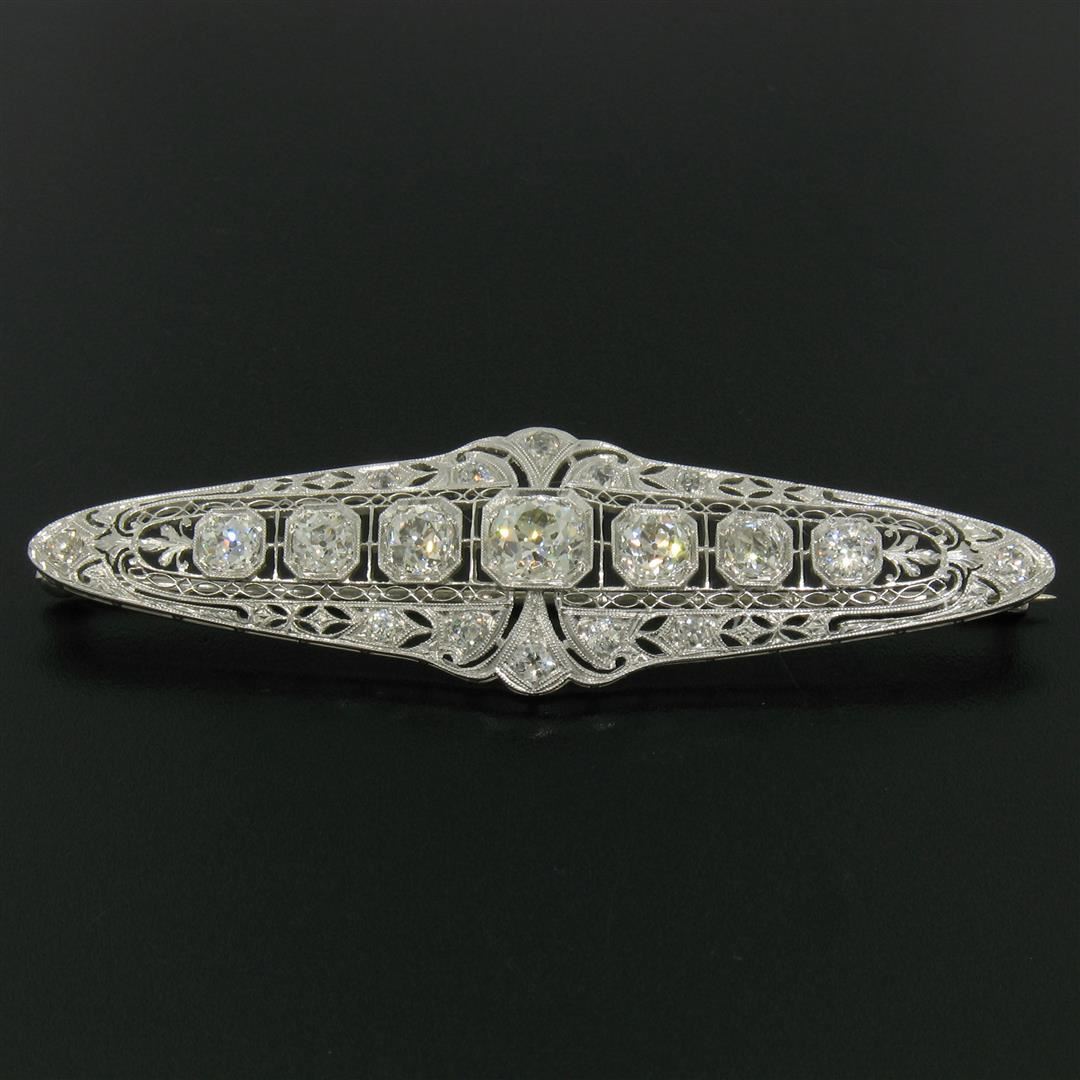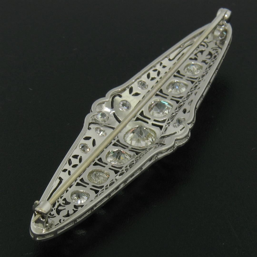 An art deco period platinum filigree brooch with a central 1.58ct old European cut diamond (K - SI1) surrounded by 4.42ctw of European and mine cut diamonds (G to I - VS2 to SI2). Measures 21.10x75.05mm and weighs a total of 12.84 grams.