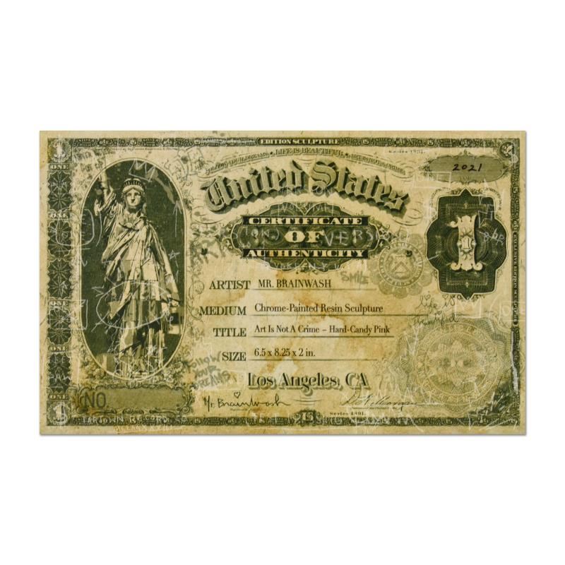 "Art Is Not a Crime (Chrome Pink)" is a limited edition resin sculpture by Mr. Brainwash, numbered and hand signed by the artist. Includes Certificate of Authenticity. Measures approx. 8" x 6.5" x 2".