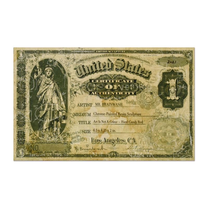 "Art Is Not a Crime (Chrome Red)" is a limited edition resin sculpture by Mr. Brainwash, numbered and hand signed by the artist. Includes Certificate of Authenticity. Measures approx. 8" x 6.5" x 2".