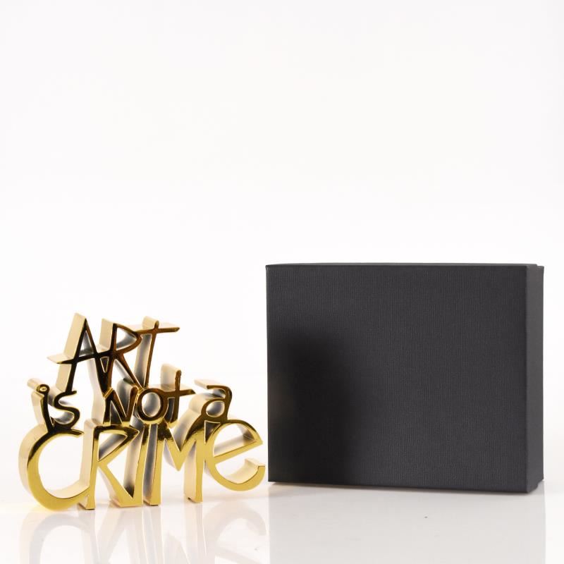"Art Is Not a Crime (Gold)" is a limited edition resin sculpture by Mr. Brainwash, numbered and hand signed by the artist. Includes Certificate of Authenticity. Measures approx. 8" x 6.5" x 2".