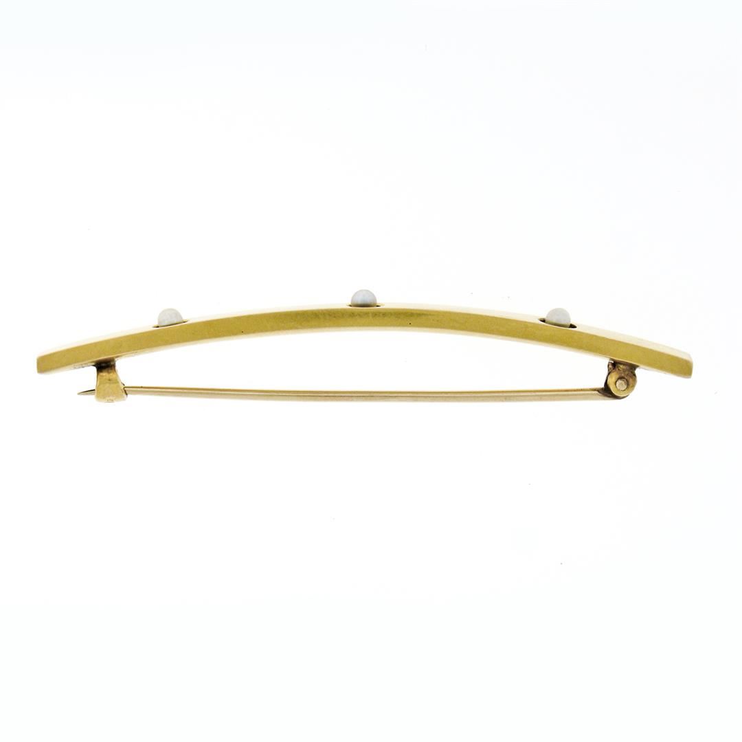 An art nouveau period 14k yellow gold bar pin featuring 3 natural round seed pearls (2.5mm). Measures 63.1x4.8mm and weighs a total of 3.98 grams.