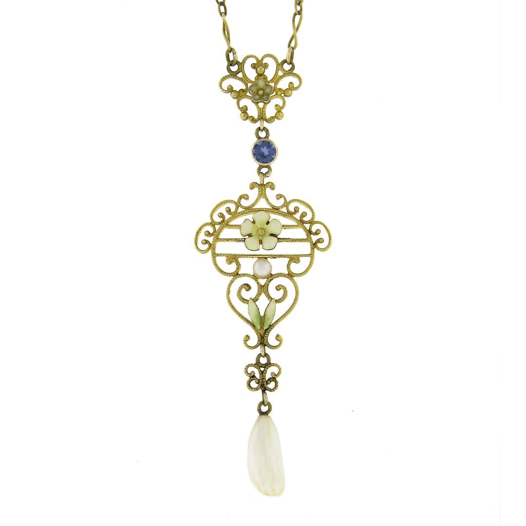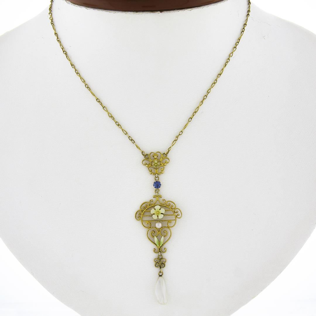 An antique solid 14k yellow gold pendant necklace by Krementz, featuring 1 old cut natural montana sapphire (3.15mm), 1 round bead shape cultured seed pearl (2.5mm ), and 1 baroque shape cultured pearl (10.6x4.5mm). 16 inch infinity & cable link chain, 3.92 grams total weight, pendant measures 58.8x18.5mm.