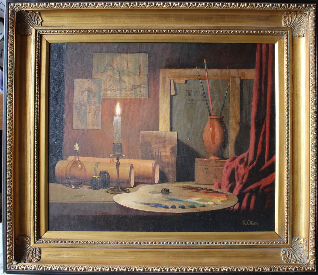 A lit candle, a paint palette, sketches, the artist's name on the back of a painting - these are some of the items that draw you into believing you're looking at Konstantin Ohotin's actual studio setting. The oil on canvas measures 19.5 x 23.5; framed image measures 31.5 x 35.5.