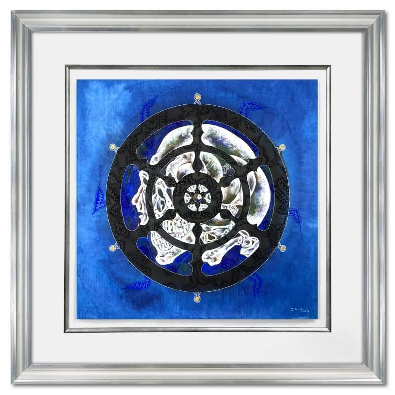 "Ashtamangala Dravya - Wheel" is an original mixed media painting on paper by Lu Hong, hand signed by the artist. This piece comes custom framed. Includes Letter of Authenticity. Measures approx. 31" x 31.5" (frame), 20" x 20" (image).