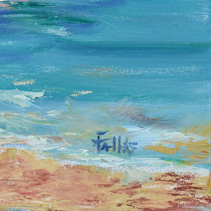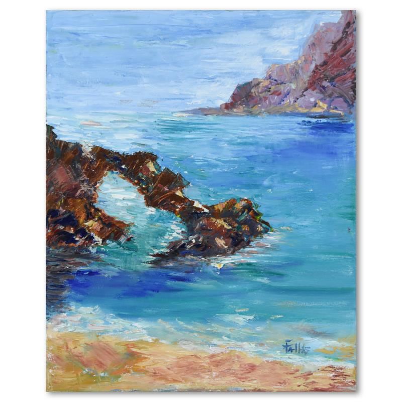 At the Cove by Fallas Original. Please see photos and description for all available information. "At the Cove" is an original oil painting on stretched canvas by Elliot Fallas, hand signed by the artist. Includes Letter of Authenticity. Measures approx. 16" x 20" (image). The sides of the canvas are painted and it can be hung as is, but a frame is definitely recommended.