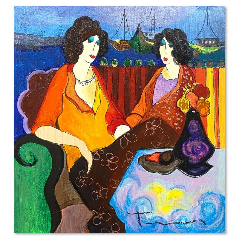 "At the Port" is a one-of-a-kind mixed media over paint on wood by Itzchak Tarkay (1935-2012), hand signed by the artist. Includes Letter of Authenticity. Measures approx. 9" x 8.5" (image).
