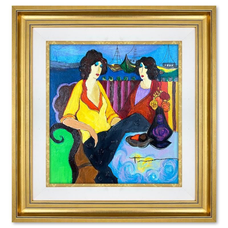 "At the Port" is a one-of-a-kind mixed media over paint on wood by Itzchak Tarkay (1935-2012), hand signed by the artist. This piece comes custom framed. Includes Letter of Authenticity. Measures approx. 17" x 16.5" (frame), 9" x 11.5" (image). This item requires special handling and may have a longer than usual turnaround.
