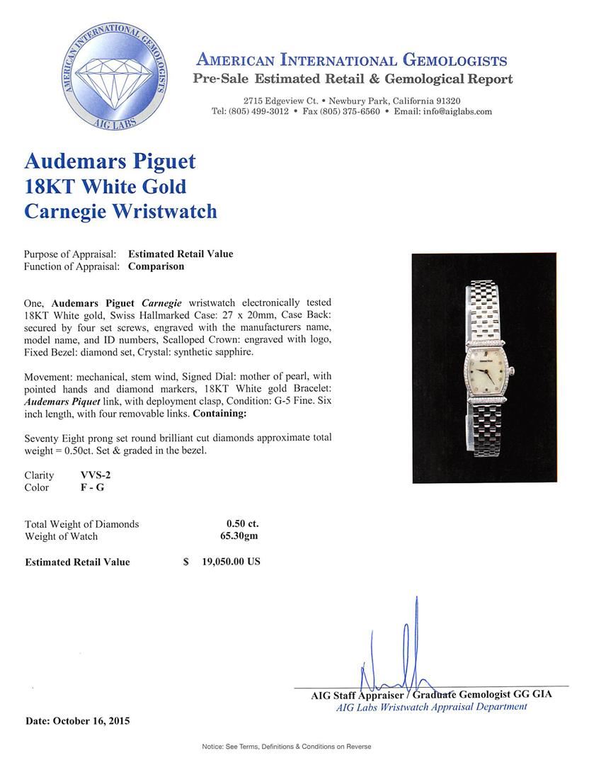 One, Audemars Piguet Carnegie wristwatch electronically tested 18KT White gold, Swiss Hallmarked Case: 27 x 20mm, Case Back: secured by four set screws, engraved with the manufacturers name, model name, and ID numbers, Scalloped Crown: engraved with logo, Fixed Bezel: diamond set, Crystal: synthetic sapphire. Movement: mechanical, stem wind, Signed Dial: mother of pearl, with pointed hands and diamond markers, 18KT White gold Bracelet: Audemars Piquet link, with deployment clasp, Condition: G-5 Fine. Six inch length, with four removable links. Containing: Seventy Eight prong set round brilliant cut diamonds approximate total weight = 0.50ct. Set & graded in the bezel. Clarity: VVS-2Color F - G. Total Weight of Diamonds 0.50ct. Weight of Watch 65.30gm. AIG Appraised at $19,050.00.