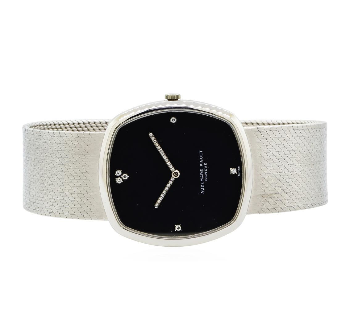One, Audemars Piguet vintage wristwatch electronically tested 18KT White gold, Case: 33 x 32mm, Case Back: secured by four set screws, Inner Case Back: Swiss Hallmarked, Scalloped Crown, Fixed Bezel: high polish finish, Crystal: synthetic sapphire. Condition: G-6 Extra Fine. Audemars Piquet Movement: seventeen jewel Swiss mechanical, stem wind, adjustments for heat & cold, Isochronism, and 5 positions, Audemars Piquet Signed Dial: Black color, with pointed hands and diamond markers, Integral 18KT White gold Bracelet: flexible mesh, Audemars Piquet clasp, Swiss hallmarked, Condition: Seven inch length. Containing: Weight of Watch 94.84gm AIG Appraised at $34,000.00.