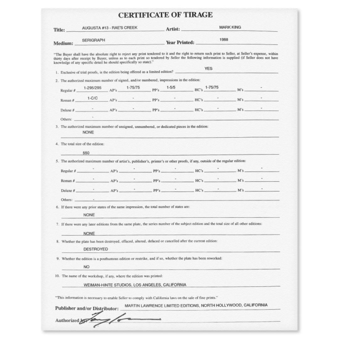 "Augusta #13 Rae's Creek" is a limited edition serigraph on paper by Mark King (1931-2014). Hand signed and numbered, this piece comes with a letter of authenticity and measures approximately 40" x 30" (image).