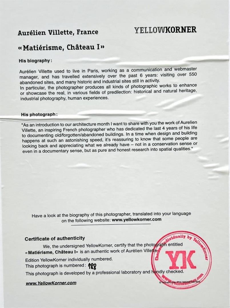 Aurelien Villete France Matierisme Chateau I YellowKorner Certified Photograph. Certificate of Authenticity from YellowKorner affixed to the back. Matted Dimensions 16"x20". Protected with Clear Mylar Sleeve.