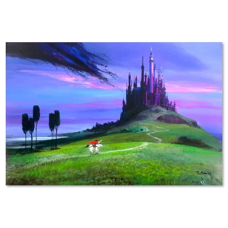 Auroras Rescue is a limited edition giclee on stretched canvas, numbered 143/300 and hand signed by Peter Ellenshaw (1913-2007). This piece is licensed by Disney Fine Art. Includes Letter of Authenticity. Measures approx. 36 x 24 (image). There are scuffs on the castle that are only noticeable upon close inspection.