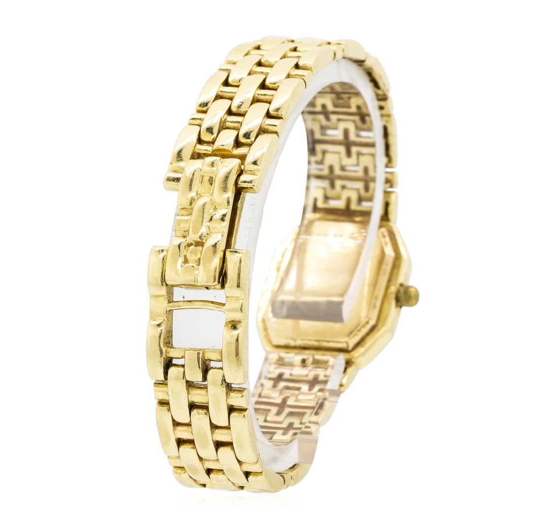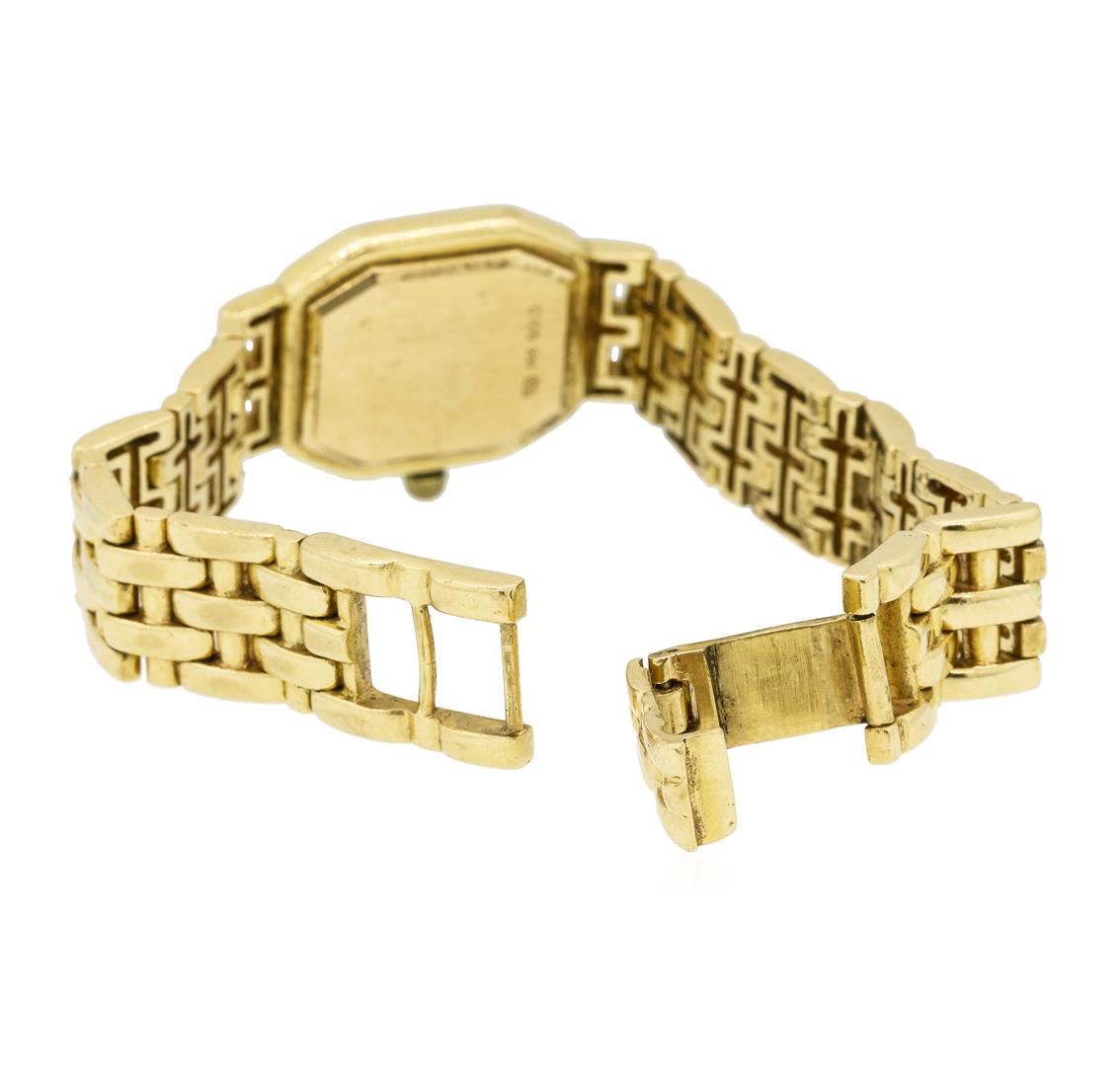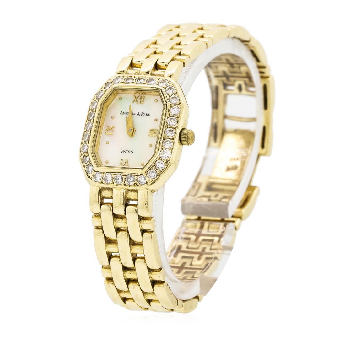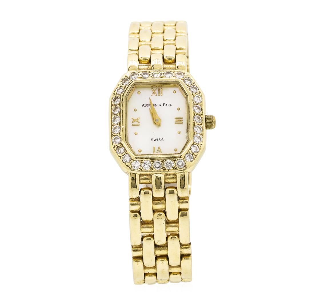 One 14KT yellow gold Austern and Paul ladie's wristwatch with a 21mm x 19mm rectangular case and mother of pearl dial with pointed baton type hands and mixed roman numeral and button markers. The movement is an ETA movement, serial number 976.001. The str