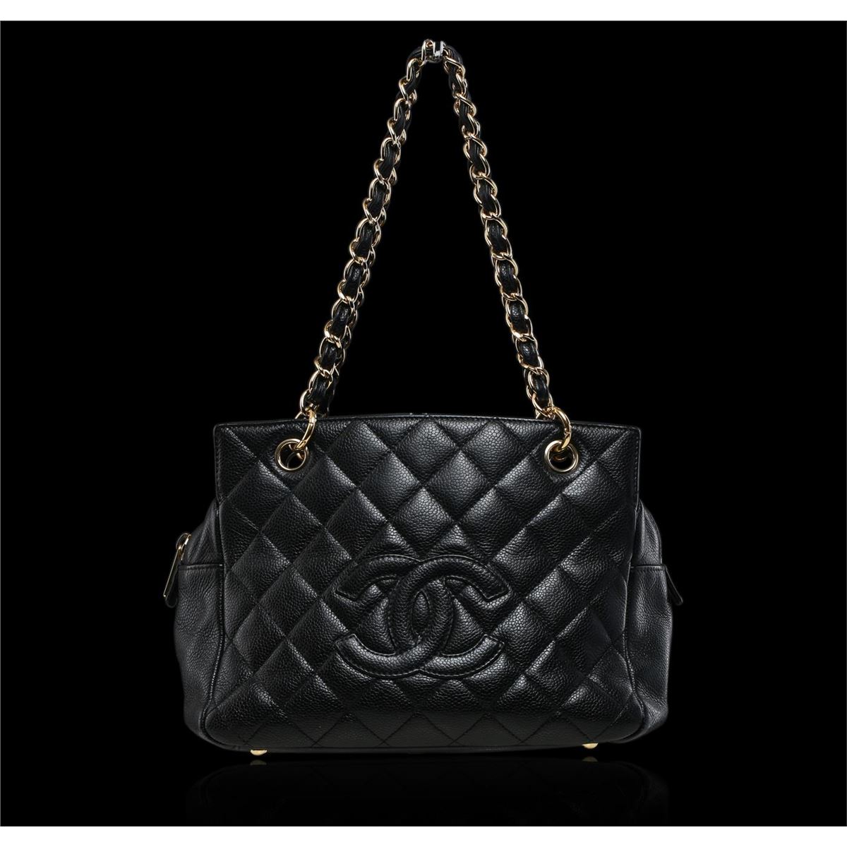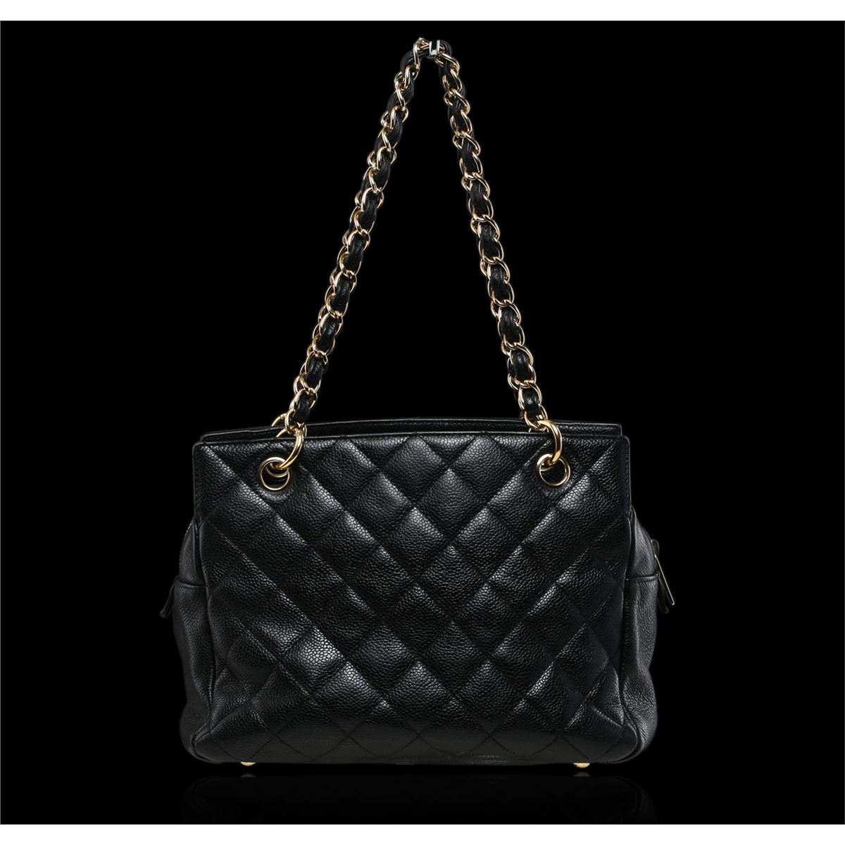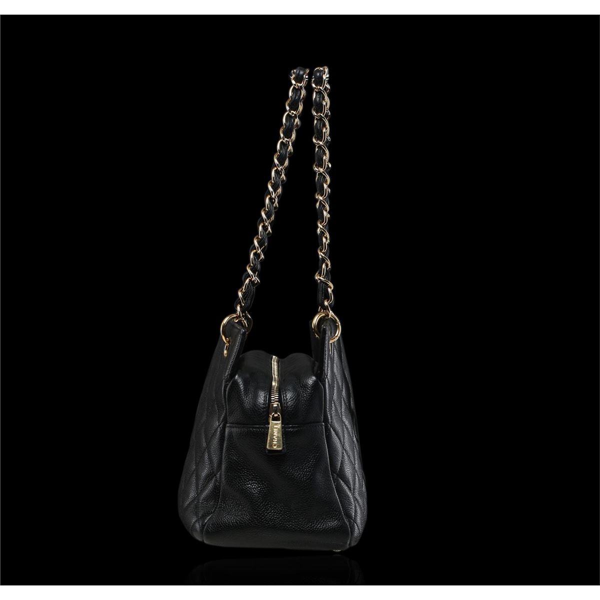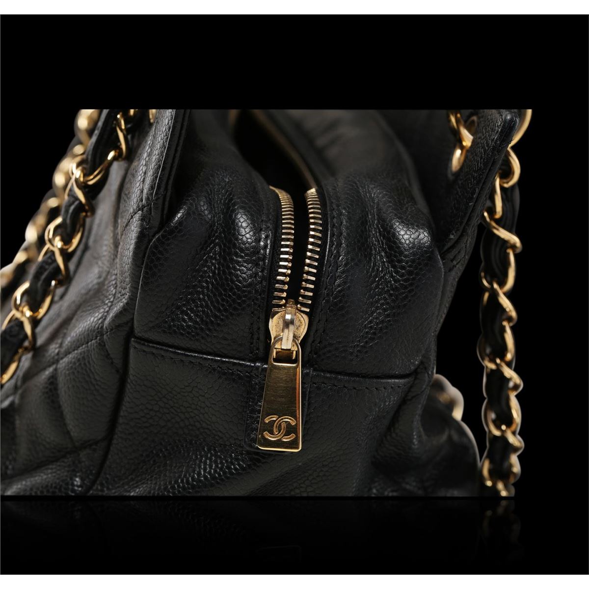 This authentic Chanel quilted caviar bag with diamond quilted leather in black features Chanel CC logo on the front one one single long leather interlaced gold chain shoulder strap. Dress up in class with this timeless Chanel Bag. The exterior is a beautiful and sturdy caviar leather. The interior is lined with Chanel black ribbed fabric, which is also very sturdy. Measures approximately: 9.8" x 7.8" x 5.1".
