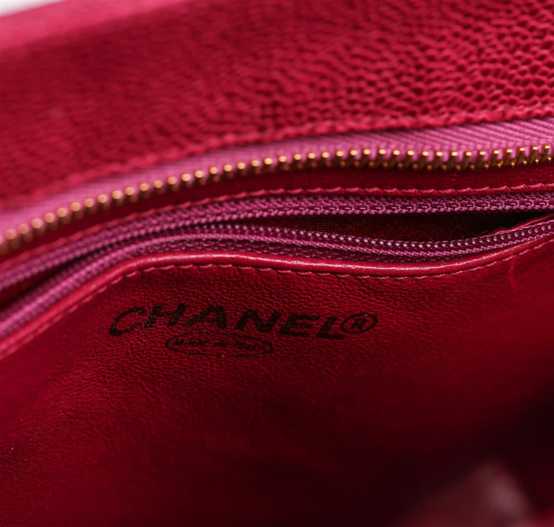 This stunning 100% authentic Chanel pink leather bag is sure to get you noticed. Crafted from exotic alligator leather (pink) and features the CC logo on the front of the bag. There is a chic pocket compartment on the reverse side of the bag to store personal items and keep them close at hand. The bag also features a zip closure with gold tone hardware. The two interior pockets (one zip pocket) keeps you organized. This bag is comfortable to carry and will surely complete your look. Condition: Good condition with no signs of wear or odor. Measurements: 12" wide, 9.5" tall, 6.5" handle drop.